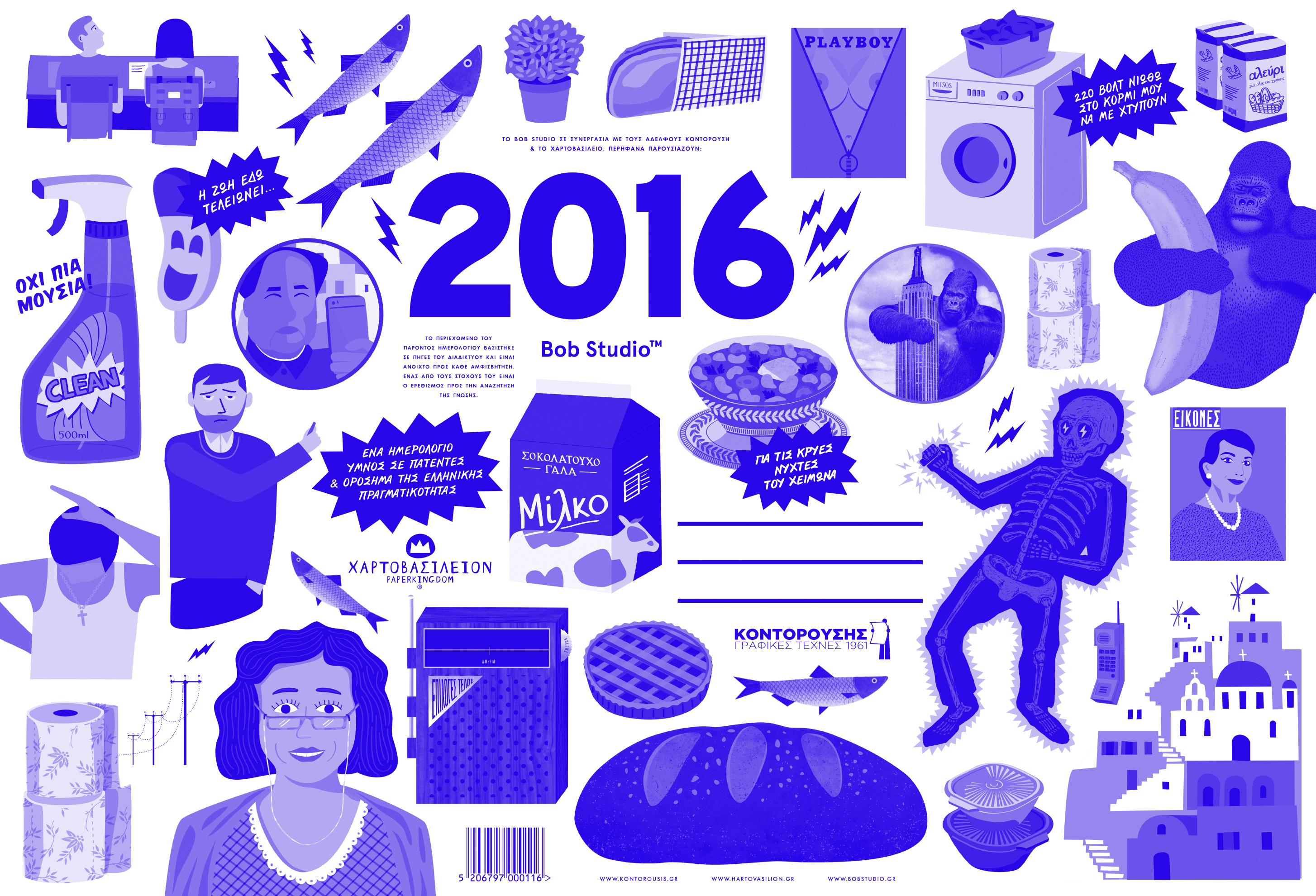 Είναι το ημερολόγιο του πολυβραβευμένου δημιουργικού γραφείου Bob Studio, που εκδίδεται σε συνεργασία με το Χαρτοβασίλειον. To Bob Studio εδρεύει στο «Νότιο Κουκάκι» (αυτήν την γεωγραφική πατέντα της Popaganda) κι έχει βασικό πυρήνα τους Άρη Τσούτσα και Ανδρέα Θάνο. «Είμαστε οι 7 και είμαστε υπέροχοι», είναι το μότο της ομάδας που έχει για μασκότ έναν τεράστιο σκύλο, τον Μπόμπο. Οι δημιουργίες τους χαρακτηρίζονται από το χιούμορ, την καθαρή, ενίοτε vintage (όχι όμως ρετρό) εικονογράφηση και την ευρηματικότητά τους, καθώς μιλάνε μια γλώσσα με διεθνή χαρακτηριστικά χρησιμοποιώντας ελληνικό λεξιλόγιο. Χαρακτηριστικά που συμπυκνώνονται στο ημερολόγιο, μια ιδέα που ξεκίνησε σε μικρή κλίμακα το 2013. Τότε η πρώτη έκδοση του Bob Calendar περιείχε illustrations απoκλειστικά με ελληνικές ευρεσιτεχνίες ή και σπουδαίες ανακαλύψεις όπως το «Τεστ Παπ». Τέτοια ήταν η επιτυχία του στο μικρό κύκλο που μοιράστηκε που αρκετός κόσμος ζητούσε την έκδοση του ’13 και τις δύο επόμενες χρονιές. Μπορείς να το δεις εδώ.