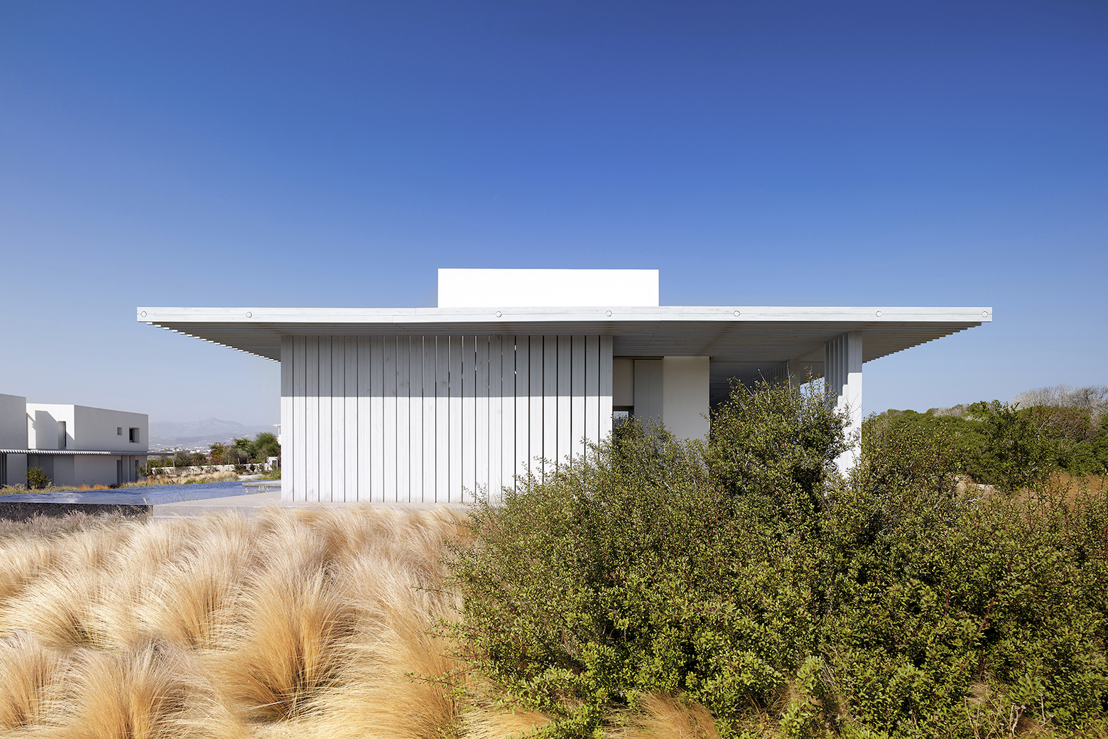 «Κάθε κτίριο επαναδιατυπώνεται ως σύνθεση κυβικών όγκων πάνω σε μια εκφρασμένη “βάση” – πλατφόρμα- που διαπραγματεύεται την αρμονική προσαρμογή στο τοπίο». Τρία μέτρα πάνω από τη «βάση», μια ξύλινη πέργκολα με τις εν προβόλω δοκούς διαγράφει σκιασμένες, άνετες και προστατευμένες από τους ανέμους περιοχές καθιστικού, ηλιοθεραπείας, ντουζ, τραπεζαρίας και προετοιμασίας φαγητού για ολοήμερη υπαίθρια κατοίκηση.