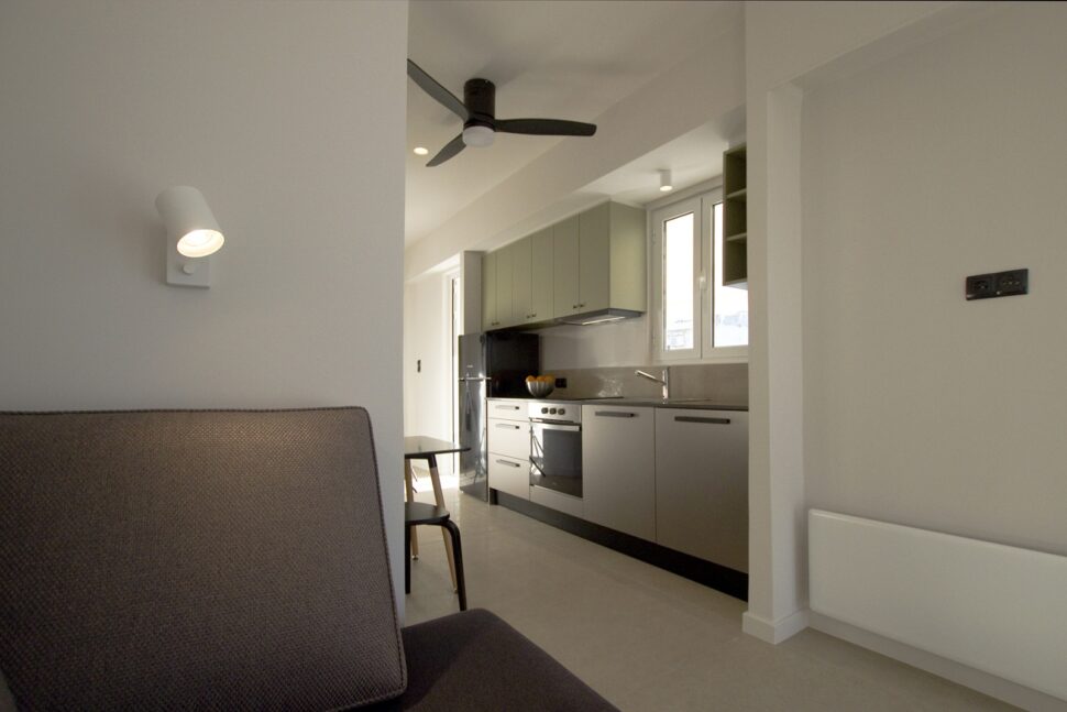 «Ενοποιήσαμε τρείς από αυτούς σε έναν ενιαίο χώρο κουζίνας, φαγητού και διημέρευσης, δημιουργώντας στη στενή πλευρά του ένα επιπλέον άνοιγμα προς την βεράντα. Ταυτόχρονα, μετατρέψαμε τον χώρο, ο οποίος χρησιμοποιούνταν ως καθιστικό, σε χώρο διπλής λειτουργίας με την κατασκευή υπερυψωμένου κρεβατιού, ώστε να λειτουργεί ως συνδυασμός υπνοδωματίου και χώρου γραφείου», αναφέρουν οι επικεφαλής αρχιτέκτονες Έλενα Εξαρχοπούλου και Πάνος Γερακάκης.