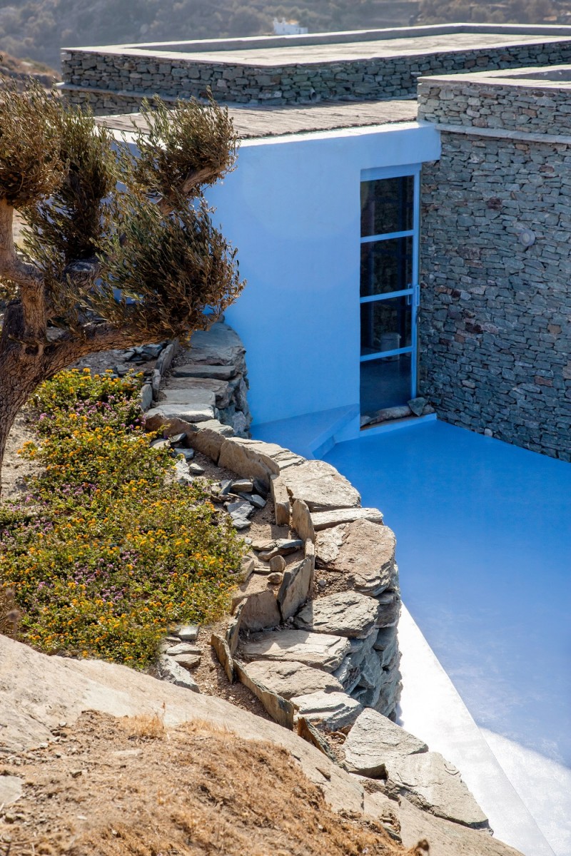 Παραπέμποντας στους άλλοτε έγχρωμους κυκλαδίτικους οικισμούς, τα δάπεδα χρωματίστηκαν στο λουλακί χρώμα του σιφνέικου ουρανού που ξεπερνά τα όρια του σπιτιού και «ξεχύνεται» στις αυλές.