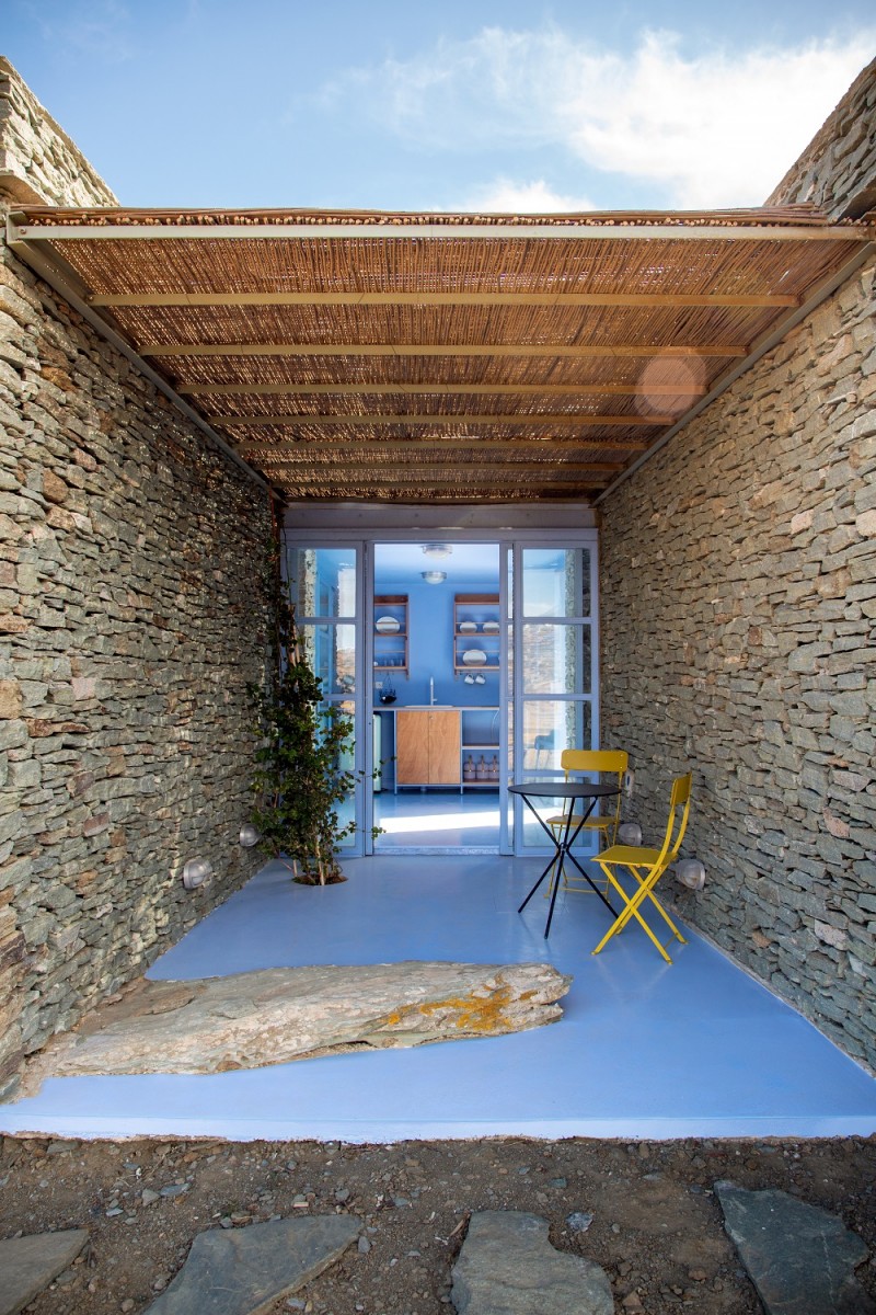 Ο όγκος της κουζίνας επεκτείνεται ανάμεσά στους πέτρινους όγκους των δωματίων, δημιουργώντας μία σκεπαστή αυλή προστατευμένη από τους δυνατούς βόρειους ανέμους.