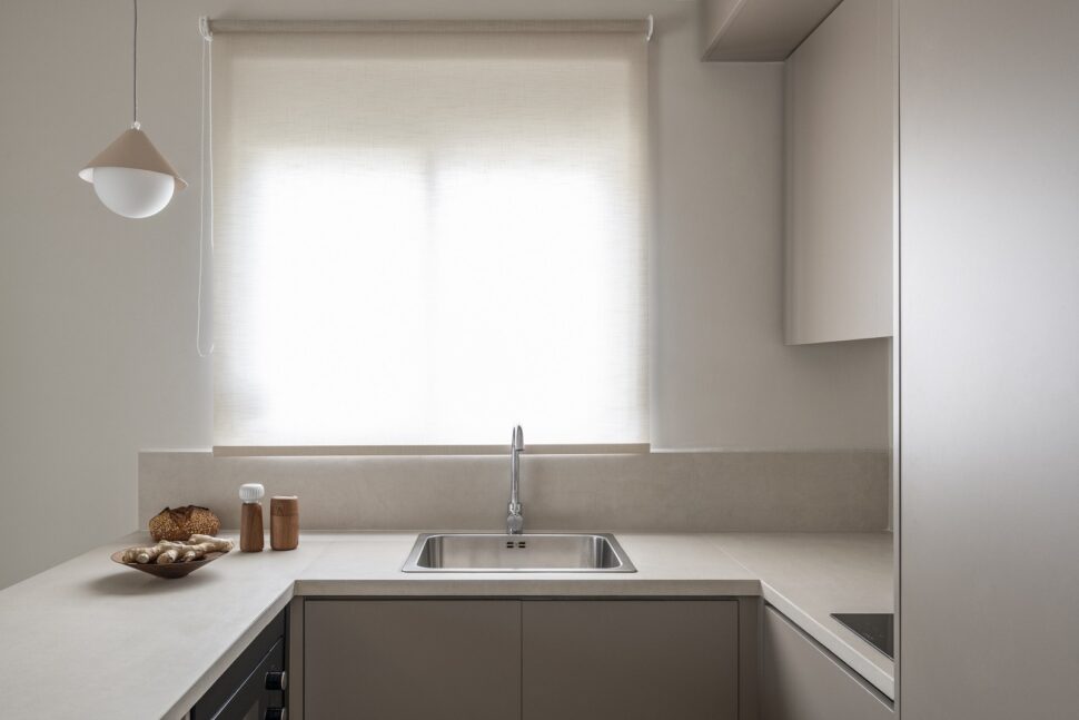 Για τον πάγκο της κουζίνας, προτιμήθηκε μπεζ κεραμικό πλακίδιο, μειώνοντας τον οπτικό θόρυβο και δίνοντας στο χώρο της κουζίνας και της τραπεζαρίας την αίσθηση ενός ενιαίου συνόλου.