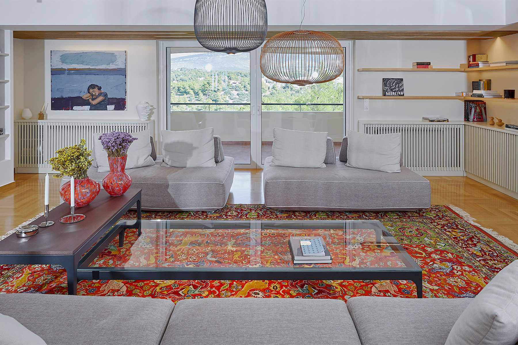 Στον χώρο του καθιστικού, το τζάκι σε συνδυασμό με τη βιβλιοθήκη αποτελούν κεντρικό στοιχείο του χώρου. Υλικά και υφές συνδιαλέγονται αρμονικά και δημιουργούν ένα ήρεμο περιβάλλον όπου έργα τέχνης βρίσκουν την θέση τους. Τα κρεμαστά φωτιστικά -Spokes 2 & Spokes 3 Designed by the Studio Garcia Cumini της εταιρίας Foscarini – στο κέντρο του καθιστικού, δημιουργούν με τη σειρά τους ένα παιχνίδι με το φως και ολοκληρώνουν τον σχεδιασμό.