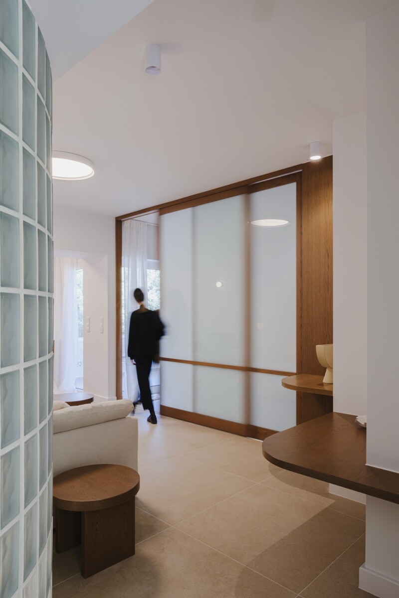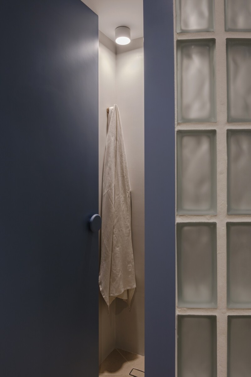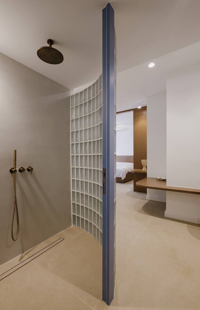 Η μη αναμενόμενη θέση του μπάνιου στην είσοδο του διαμερίσματος καταστρατηγήθηκε με τη χρήση ημιδιαφανούς υαλότουβλου και της καμπύλης γεωμετρίας που χαράχθηκε. Η δημιουργία του ορίου αυτού εντείνει και καθοδηγεί την κίνηση στους υπόλοιπους χώρους και τη διάχυση του φωτός.