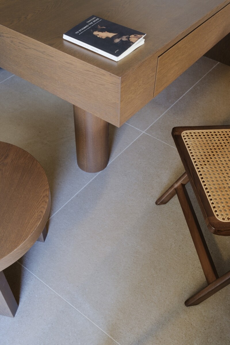 Το φυσικό ξύλο, το αμμώδες έδαφος, η ώχρα και το γυαλί δεν είναι επιλογές για μία αισθητική προσέγγιση, αλλά για μία αισθητηριακή αντίληψη του χώρου που «κινείται» μέσα από τα υλικά.