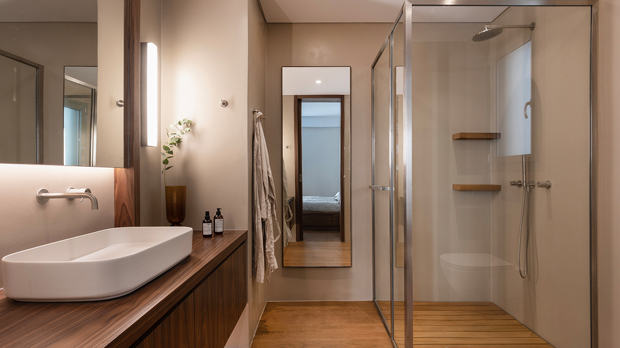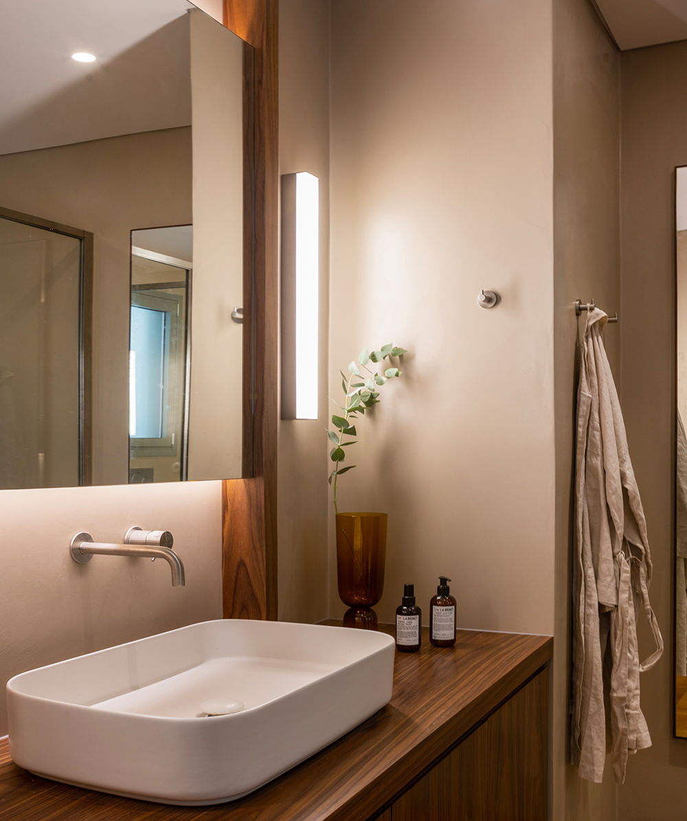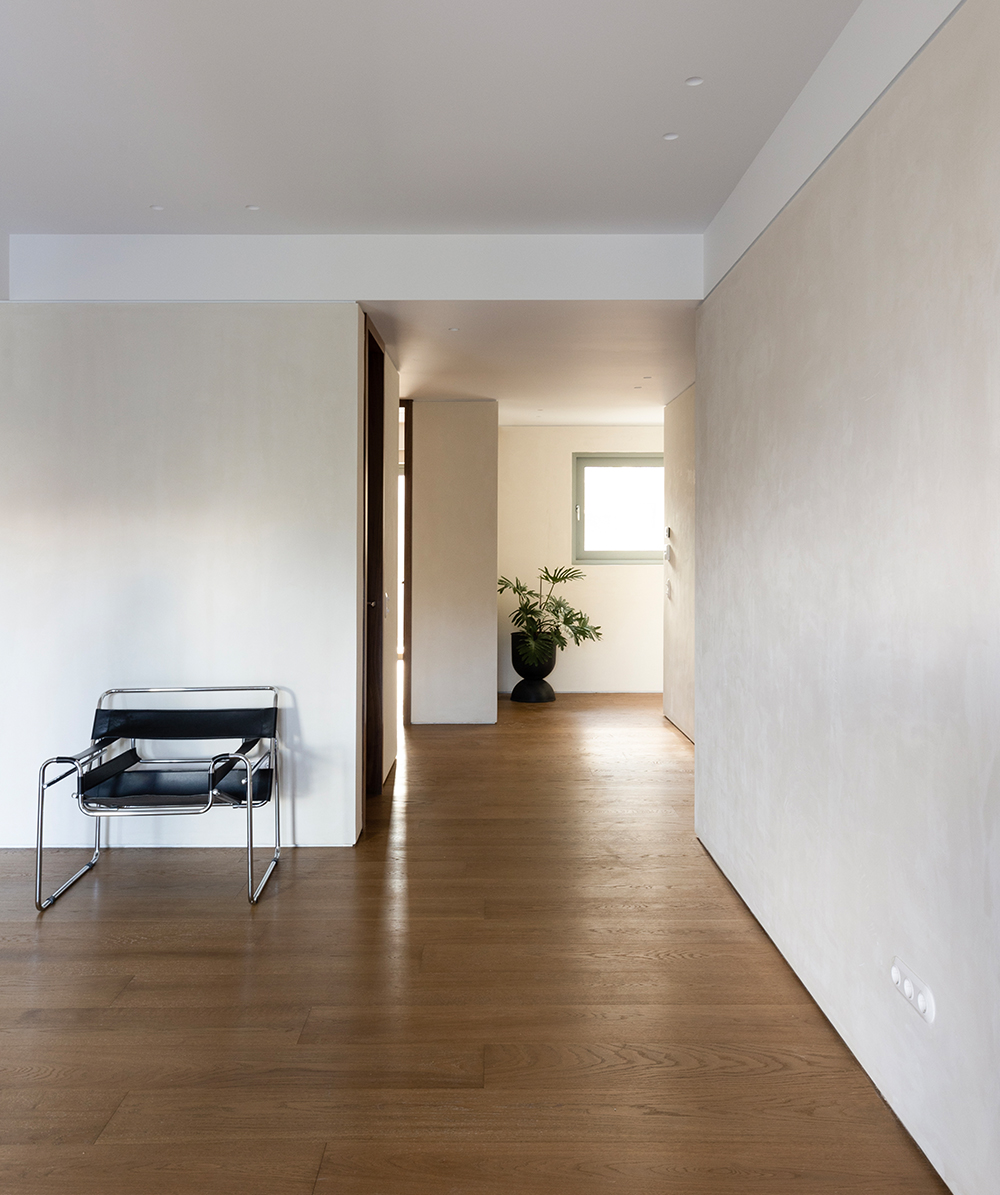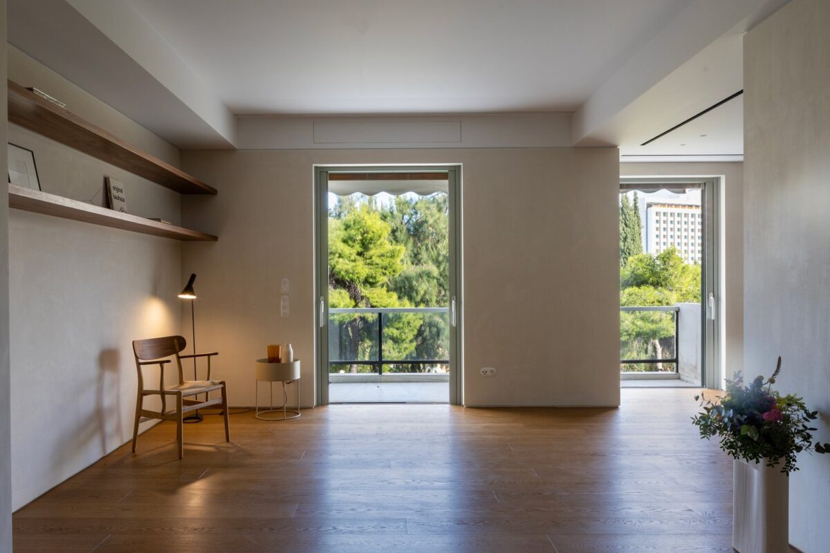Ταυτόχρονα, οι γήινοι χρωματισμοί που επιλέχθηκαν υποδέχονται με ζεστασιά τους κατοίκους αυτού του κεντρικού σημείου της πόλης, που αποζητούν την ηρεμία στην ιδιωτική τους ζωή.