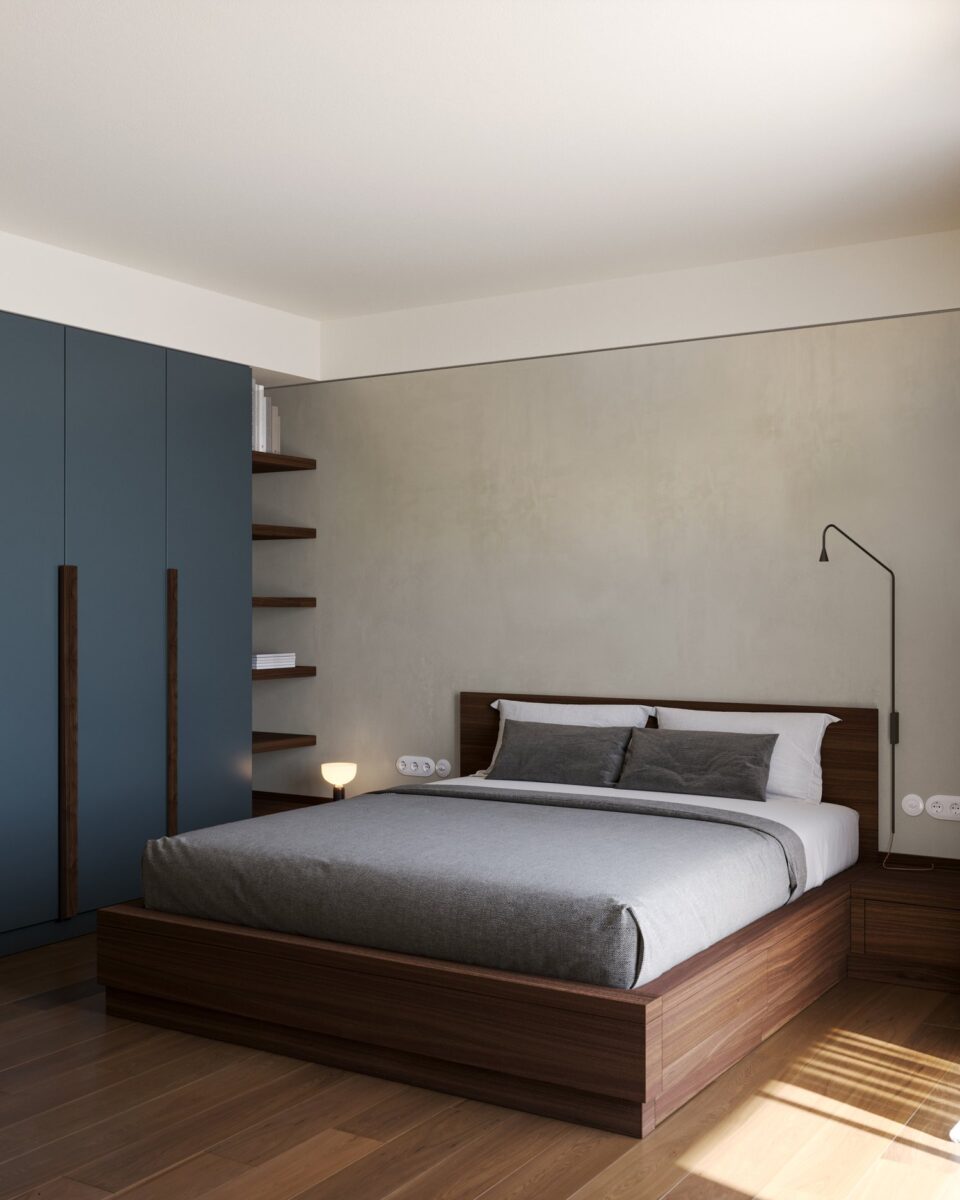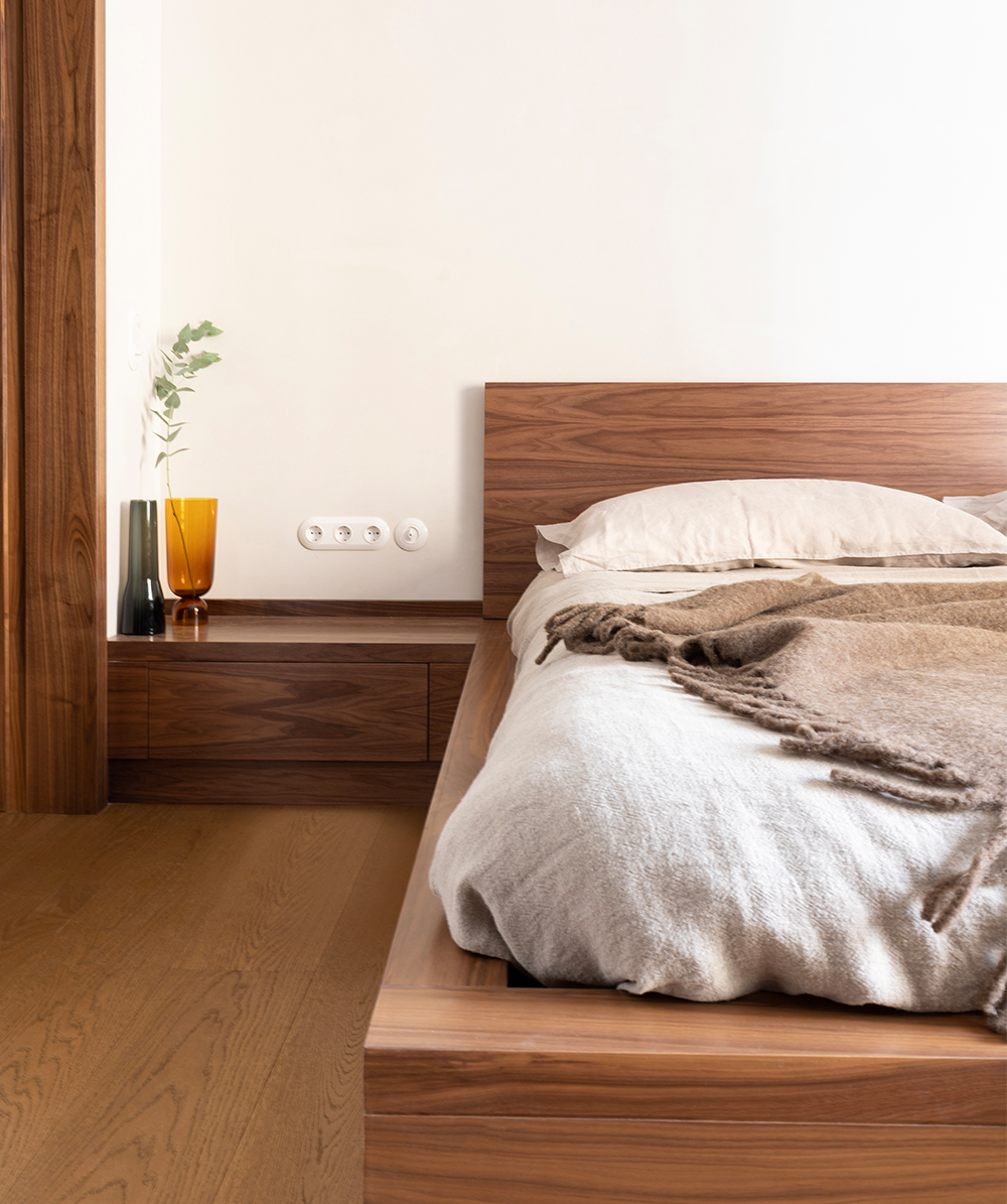 Αναμφίβολα, το ξύλο είναι το κυρίαρχο υλικό όπως φαίνεται στο δρύινο πάτωμα που έχει τοποθετηθεί σε όλα τα δωμάτια, όσο και στα έπιπλα από ξύλο καρυδιάς που κοσμούν ολόκληρο το διαμέρισμα προσφέροντας παράλληλα αποθηκευτικούς χώρους.
