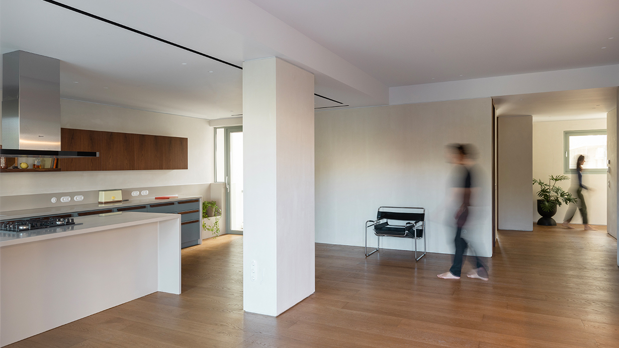 Όπως ζητήθηκε από τους ιδιοκτήτες της κατοικίας, δόθηκε έμφαση στη δημιουργία ενός πλήρως ανακαινισμένου χώρου που θα ανταποκρίνεται στον σύγχρονο τρόπο ζωής και θα ικανοποιεί τις στεγαστικές ανάγκες τους – εξού και η απουσία πολλαπλών υποδιαιρέσεων και η δημιουργία ενός ενιαίου χώρου με κουζίνα.
