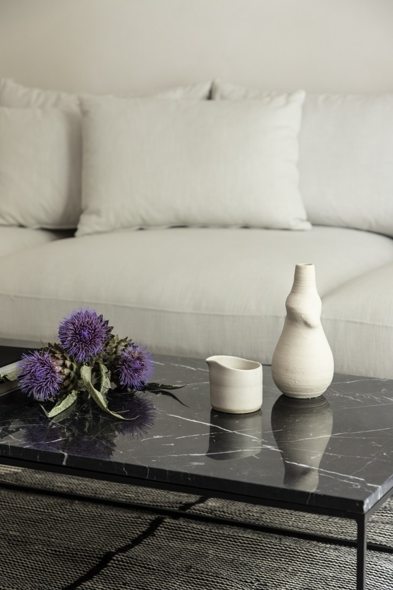 Στην επιλογή των επίπλων και των σχεδιαστικών αντικειμένων για το χώρο, κεντρική πυξίδα αποτέλεσε η λατρεία των ιδιοκτητών για τα κλασικά 50s κομμάτια. Στη συνέχεια χρησιμοποιήθηκαν επιλεγμένα υλικά όπως το φυσικό κουρασάνι στους τοίχους, στοιχείο που δίνει ιδιαίτερο βάθος στις ανοιχτόχρωμες επιφάνειες.