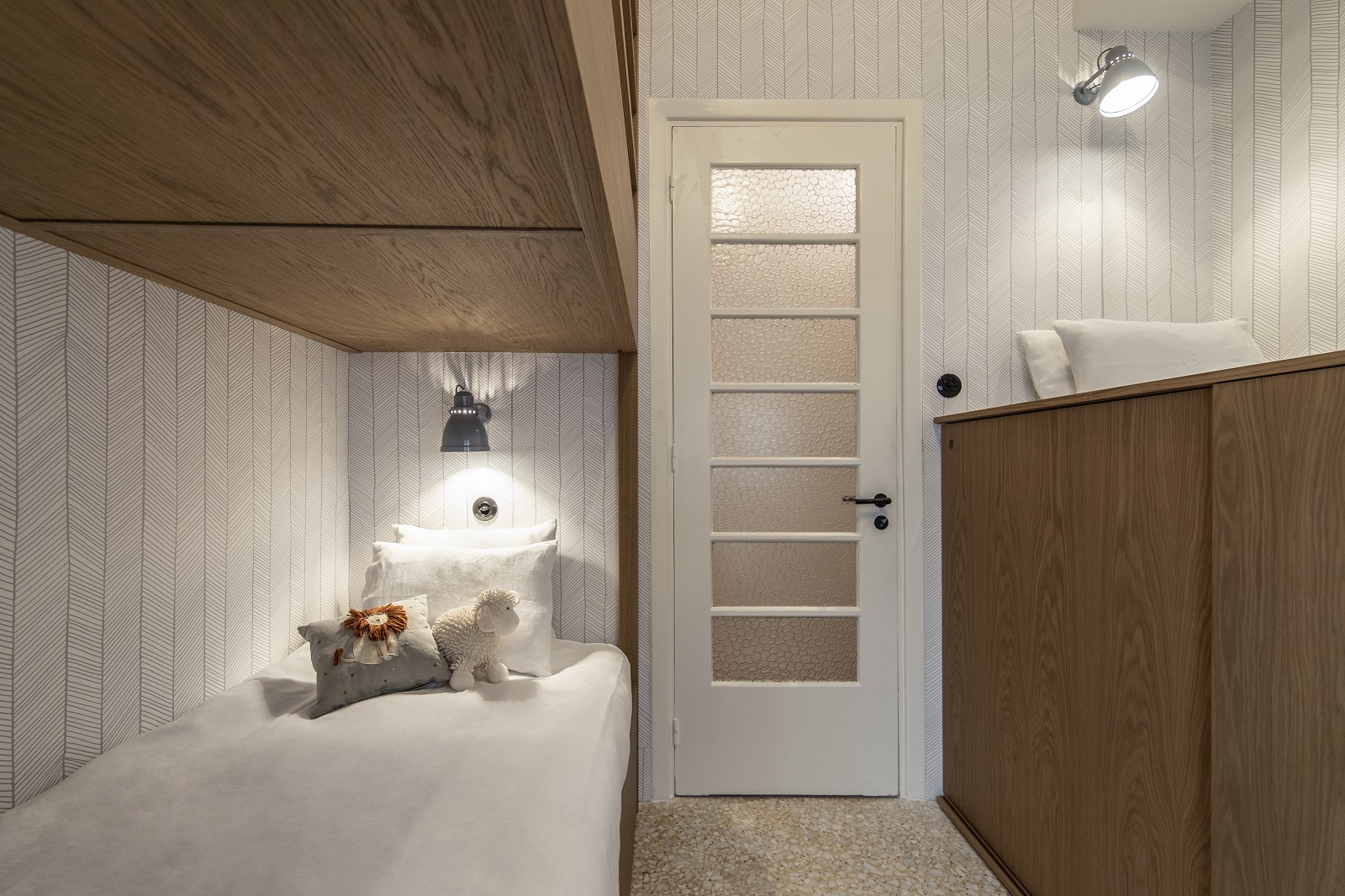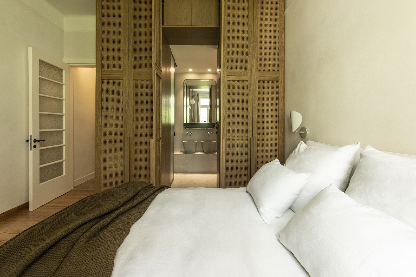 Kρυμμένοι αποθηκευτικοί χώροι και κρυφά περάσματα όπως walk through ντουλάπες με ψάθα που οδηγούν σε ένα «μυστικό» μπάνιο, συνθέτουν, σε συνδυασμό με τον αρχιτεκτονικό φωτισμό, μια μυστηριακή θεατρική ατμόσφαιρα.
