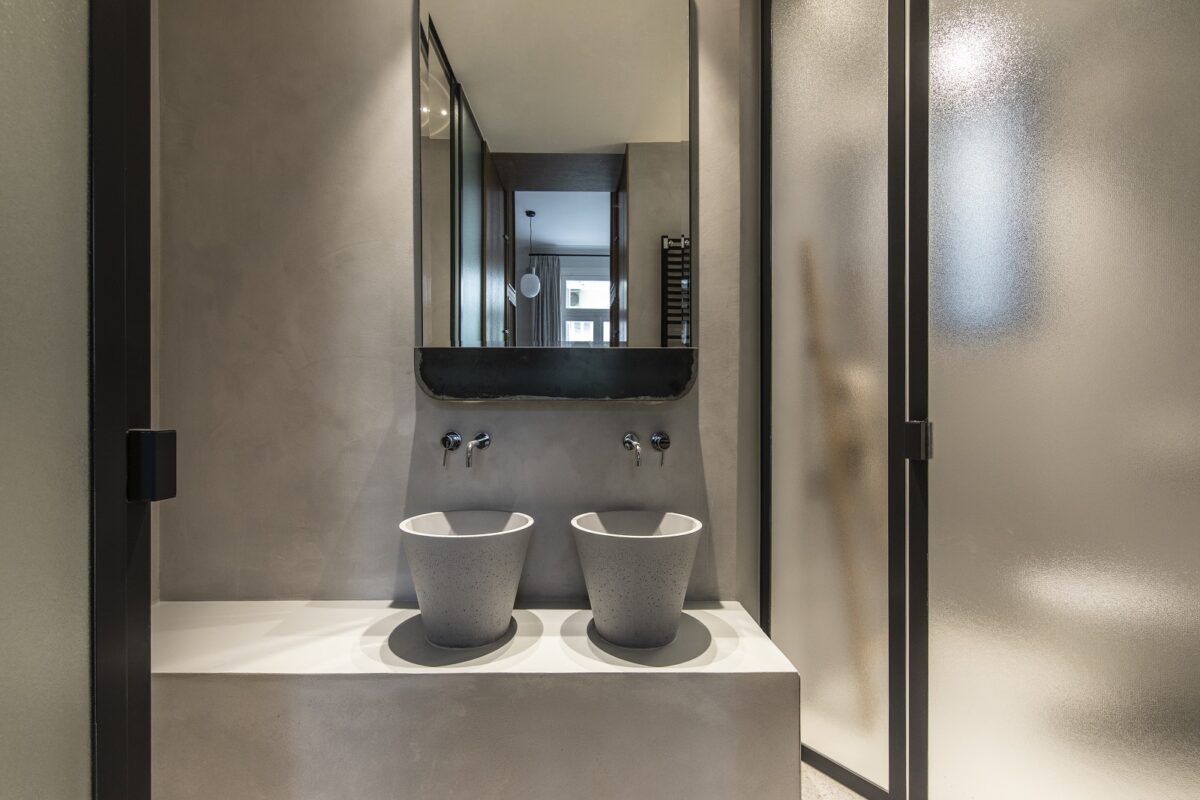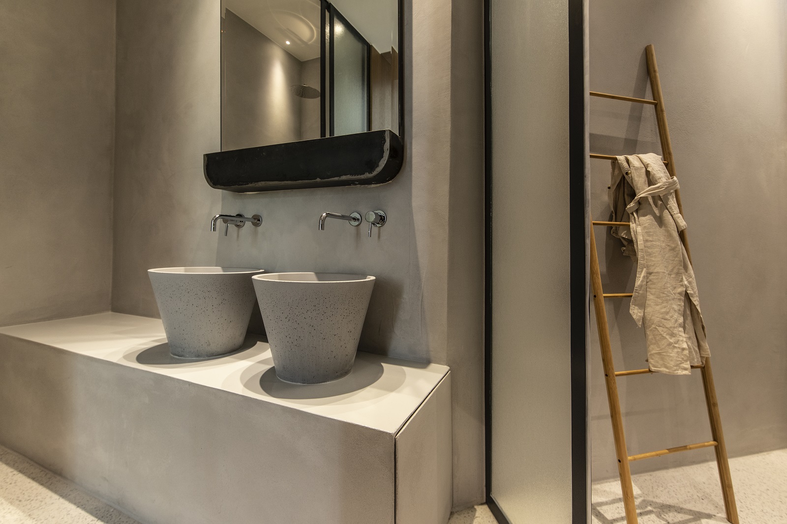 Υλικά όπως το ηφαιστειακό μάρμαρο, το ξύλο δρυ, οι μαύρες λαμαρίνες, οι βιεννέζικες ψάθες και τα τσαλακωμένα λινά Yutes σε συνδυασμό με επιλεγμένα έργα τέχνης και κεραμικά γλυπτά, ολοκληρώνουν το άρτιο αισθητικό αποτέλεσμα.