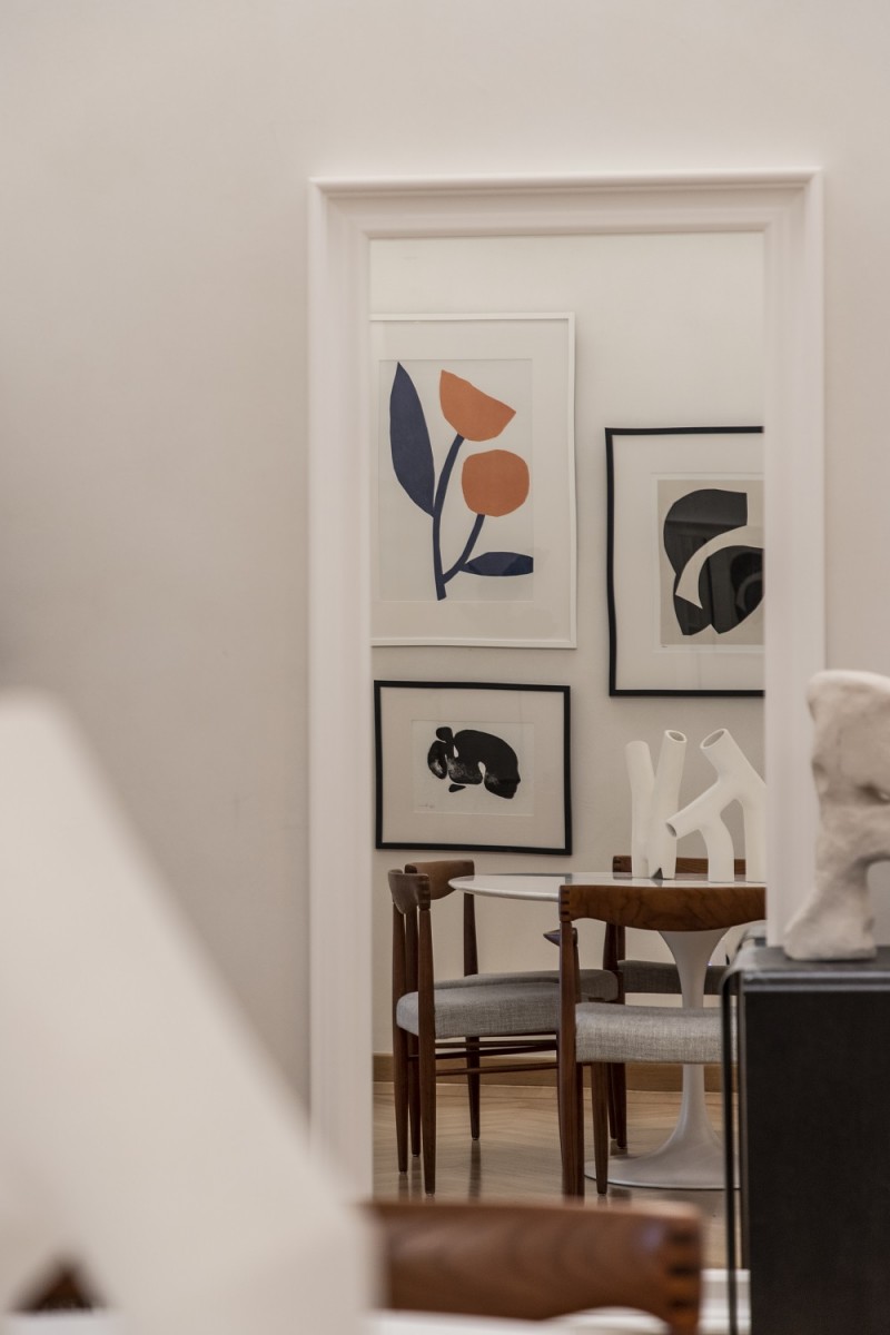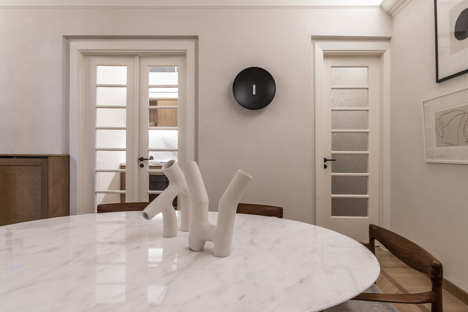 Στο τελικό αποτέλεσμα συναντά κανείς κομμάτια από διαφορετικές χώρες: το κλασικό τραπέζι της Eero Saarinen από μάρμαρο Arabesquato συνδυάστηκε με αυθεντικές καρέκλες Henry W. Klein από παλαιοπωλείο της Ολλανδίας.