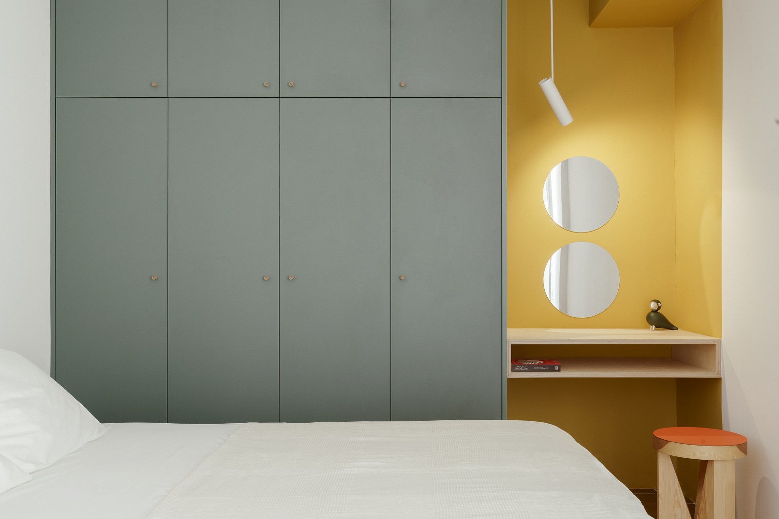 Στο ένα δωμάτιο, η αρχιτέκτονας σπάει τη μονοτονία μιας επιμήκους ντουλάπας σχεδόν 3 μέτρων, δημιουργώντας μια εσοχή που φιλοξενεί πλέον ένα γραφείο με καθρέφτη που μπορεί να χρησιμοποιηθεί για εργασία ή ως μπουντουάρ.