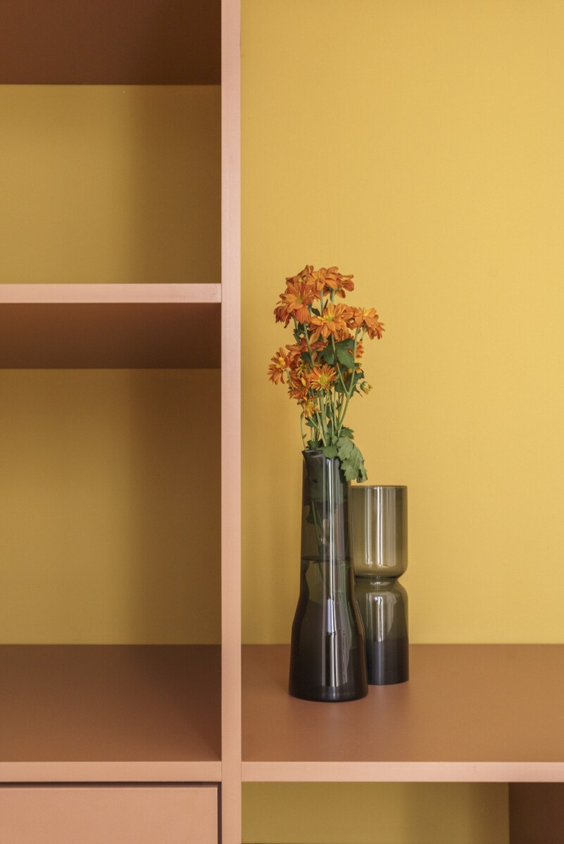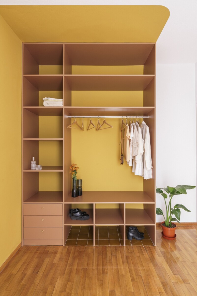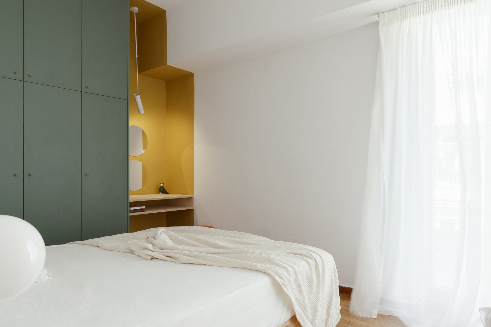 Στο διαμέρισμα, το κάθε υπνοδωμάτιο παίρνει την ταυτότητά του είτε από το συμπληρωματικό είτε από το αρμονικό χρώμα της ώχρας καθώς και από έναν ξεχωριστό ορισμό της κλασικής ντουλάπας στην κάθε περίπτωση.