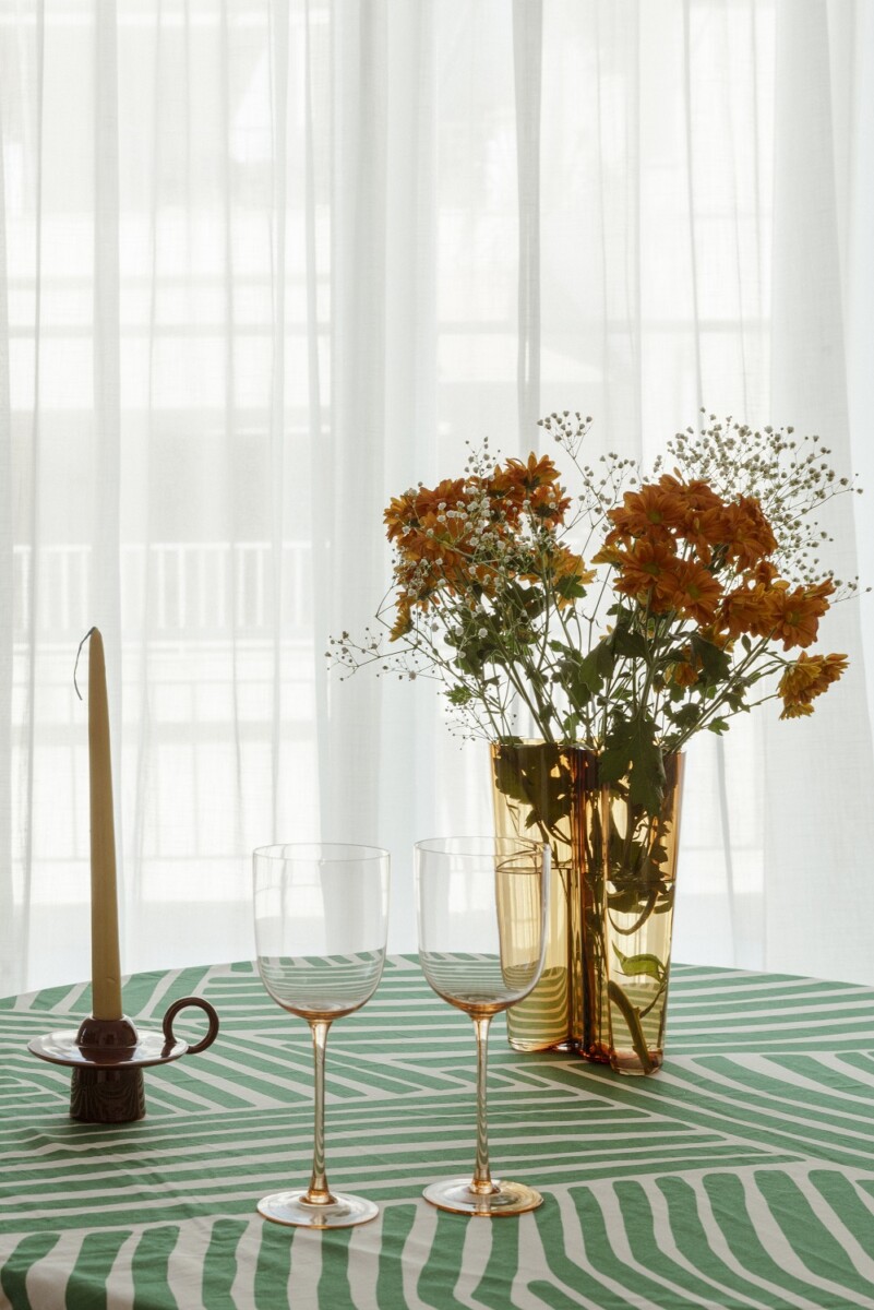 Στο καθιστικό, τα μεγάλα σε σειρά ανοίγματα ενοποιήθηκαν οπτικά με κουρτίνες που φιλτράρουν παράλληλα την οπτική σύνδεση με την απέναντι πολυκατοικία που βρίσκεται σε κοντινή απόσταση.