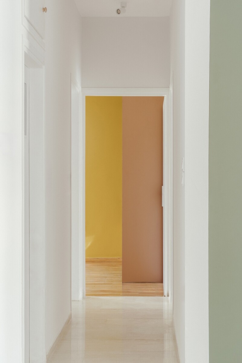 Η χρωματική ταυτότητα του διαμερίσματος δομήθηκε γύρω από το χρώμα της ώχρας του μαρμάρου Ιωαννίνων που πρωταγωνιστεί. Επιλέγοντας δύο χρώματα αρμονικά -το κίτρινο και το κεραμιδί- και ένα συμπληρωματικό – το πράσινο-, στήθηκε η νέα ταυτότητα του διαμερίσματος.
