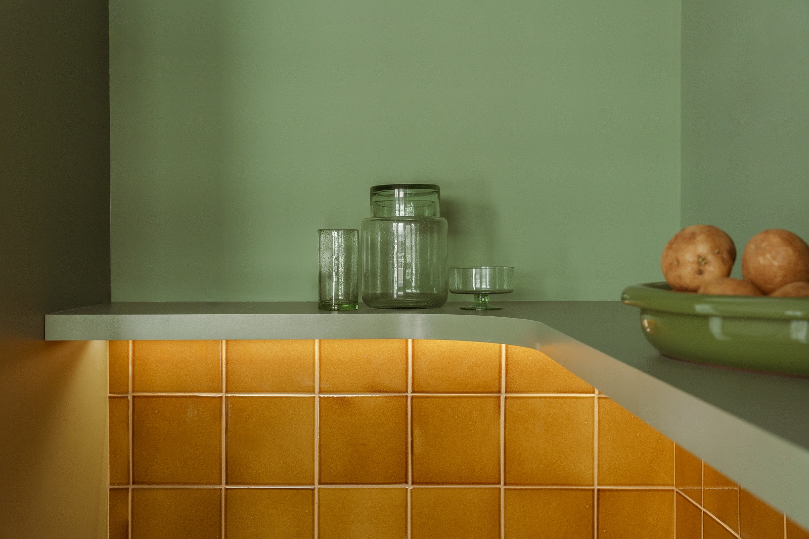 Λόγω του περιορισμένου budget τα πράσινα ντουλάπια της κουζίνας «συμπληρώθηκαν» με βαφή ίδιου χρώματος στον τοίχο, μειώνοντας έτσι τον προϋπολογισμό χωρίς αντίκτυπο στη συνεκτικότητα του σχεδιασμού.