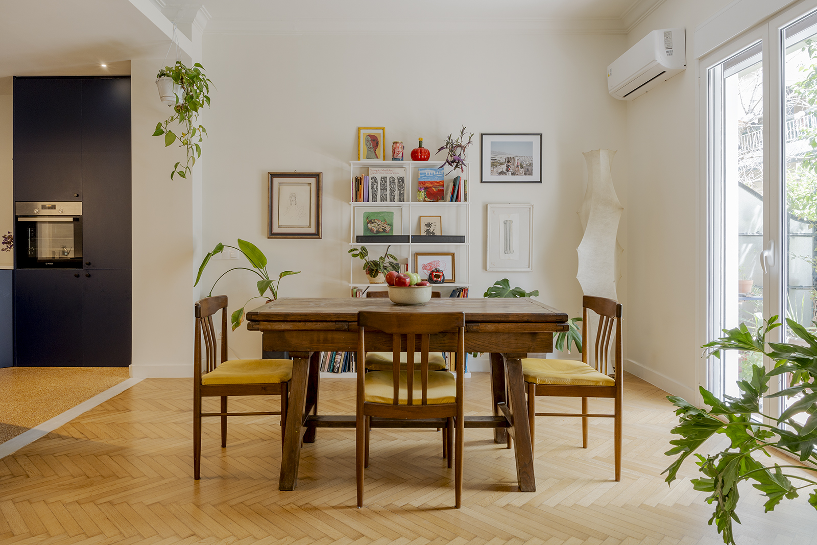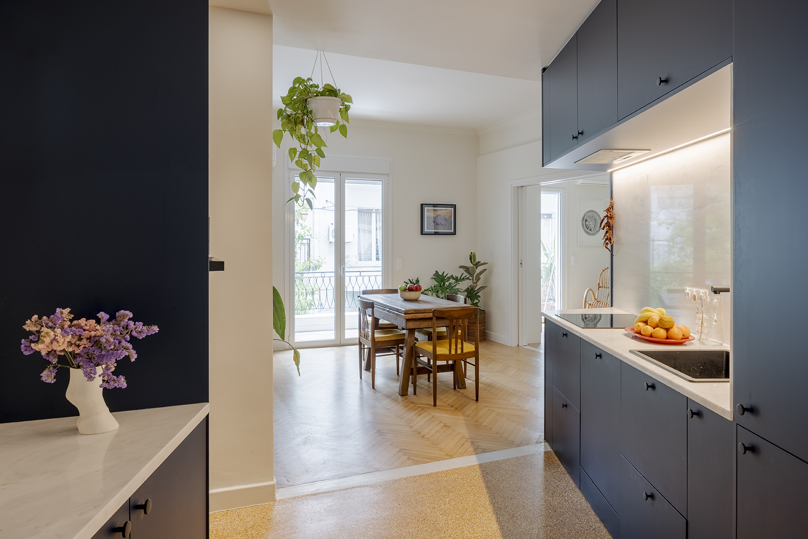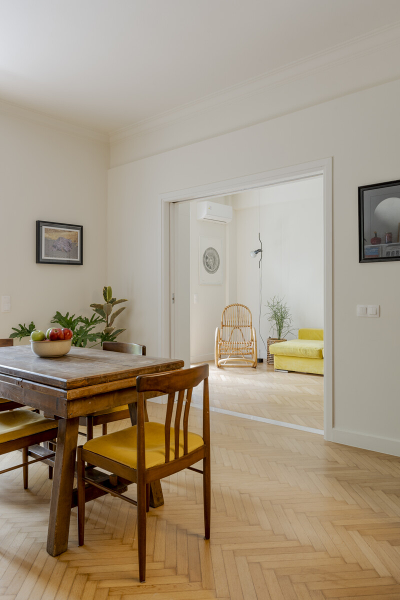 Πολλά από τα αρχικά στοιχεία αποκαταστάθηκαν προσεκτικά και αναδείχθηκαν – τα δάπεδα από μωσαϊκό και ξύλο, οι γύψινες κορνίζες της οροφής και οι παλιές πόρτες παραμένουν ως απτά ίχνη της ιστορίας του διαμερίσματος, εδραιώνοντας το έργο στο αυθεντικό του πλαίσιο.