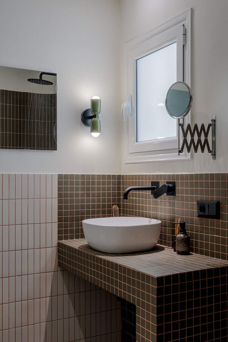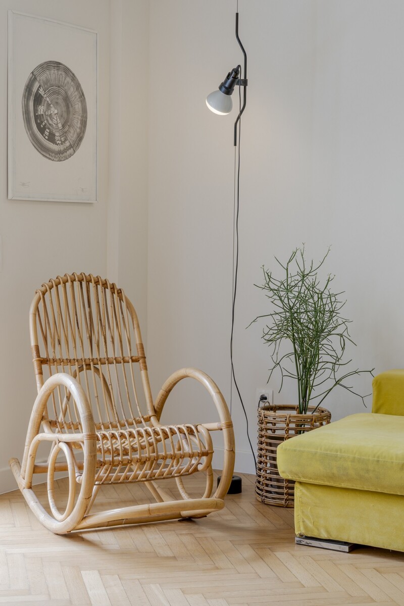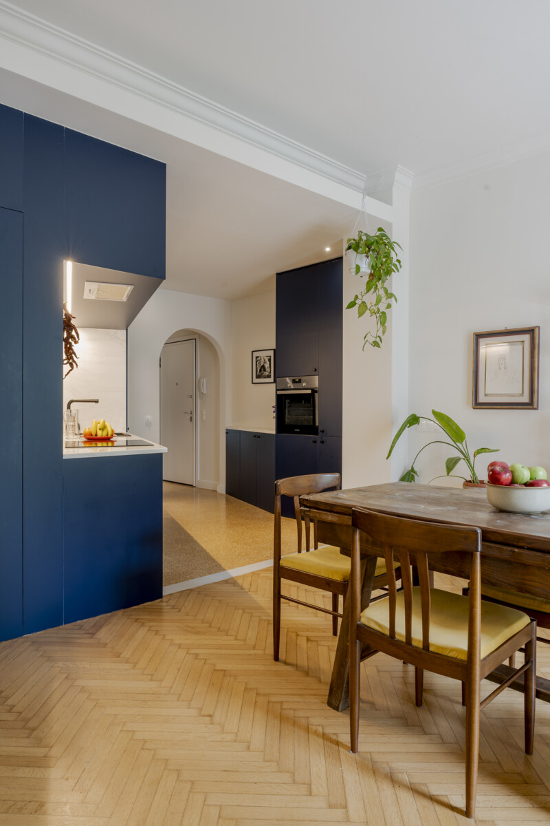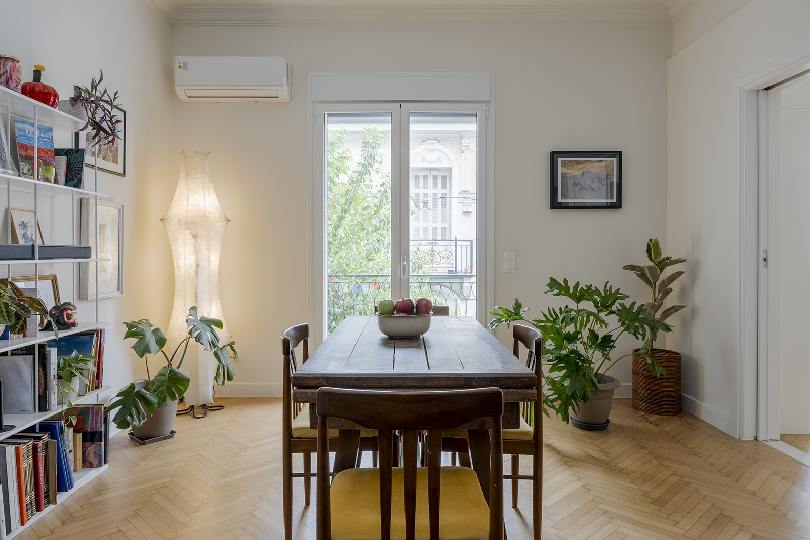 Πολλά από τα αρχικά στοιχεία αποκαταστάθηκαν προσεκτικά και αναδείχθηκαν – τα δάπεδα από μωσαϊκό και ξύλο, οι γύψινες κορνίζες της οροφής και οι παλιές πόρτες παραμένουν ως απτά ίχνη της ιστορίας του διαμερίσματος, εδραιώνοντας το έργο στο αυθεντικό του πλαίσιο.