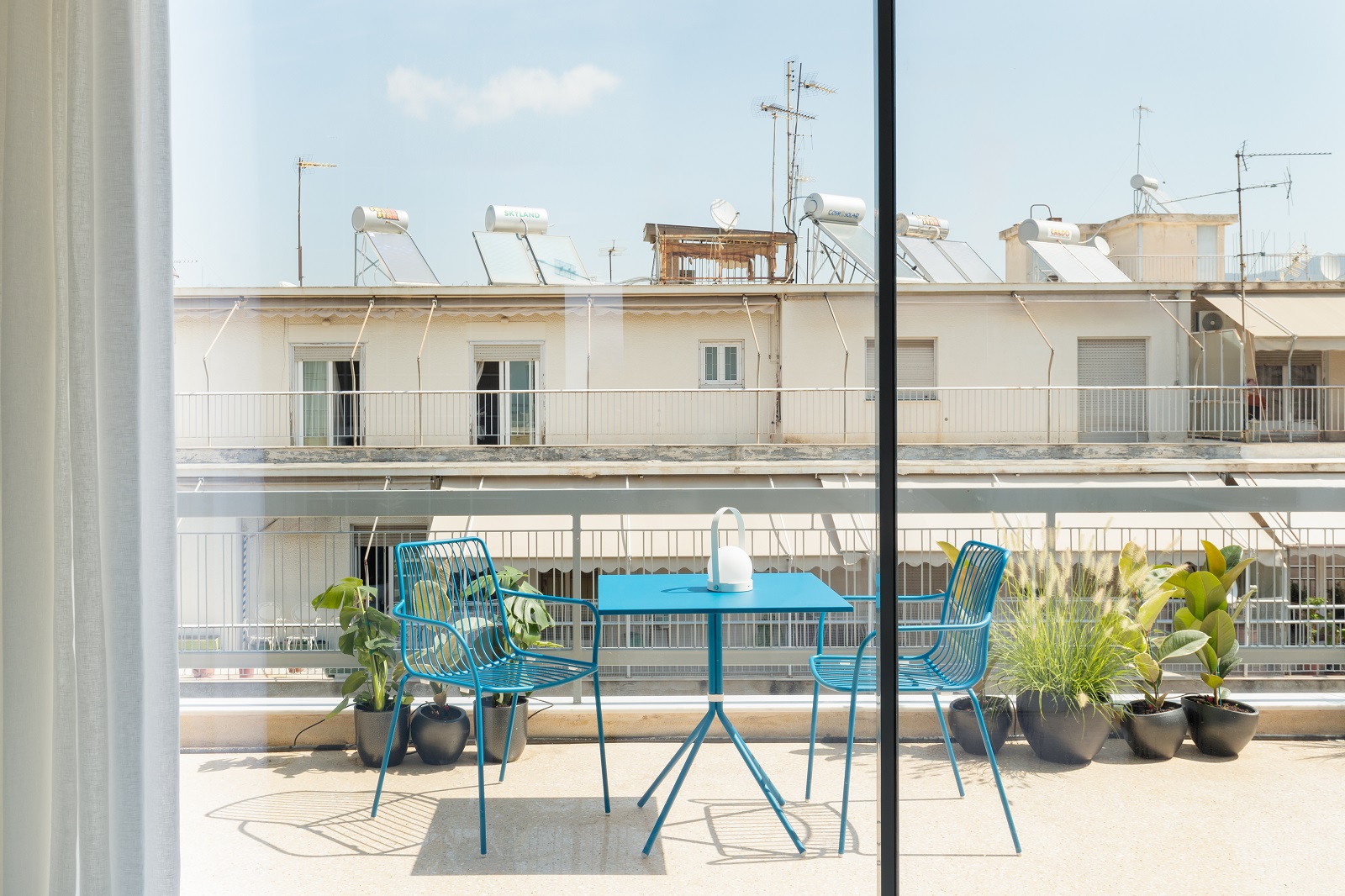 Επεκτείνοντας το κύριο άνοιγμα του καθιστικού κατά μήκος και καθ’ ύψος, δημιουργώντας έναν αστικό κήπο και προσθέτοντας το στοιχείο του νερού, η βεράντα ωθεί στην επέκταση της ζωής στην κατοικία προς τα έξω, ιδιαίτερα μέσα στο ζεστό ελληνικό καλοκαίρι.
