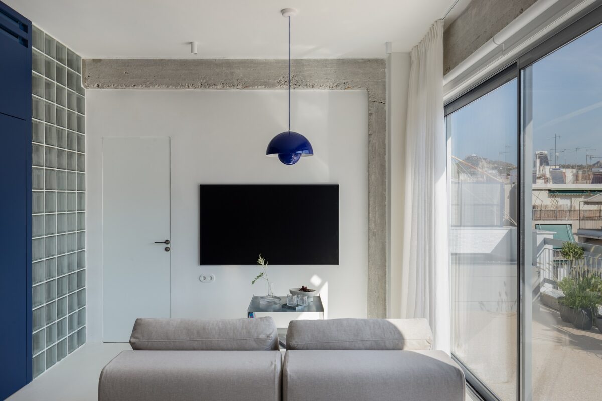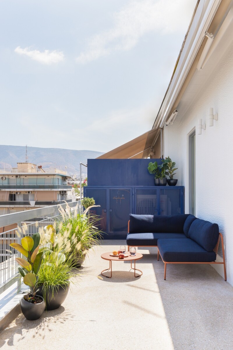Στο Παγκράτι, σε μια πολυκατοικία του ’64, η αρχιτέκτονας Έλλη Αθανασιάδου, επικεφαλής του γραφείου Space is around us, ανέλαβε την ανακαίνιση και ολική αναδιαμόρφωση του διαμερίσματος στον τελευταίο όροφο, επιφάνειας 50 τ.μ., με μια μεγάλη βεράντα που έχει μέγεθος σχεδόν το μισό του εσωτερικού του διαμερίσματος.