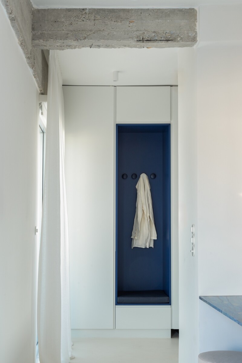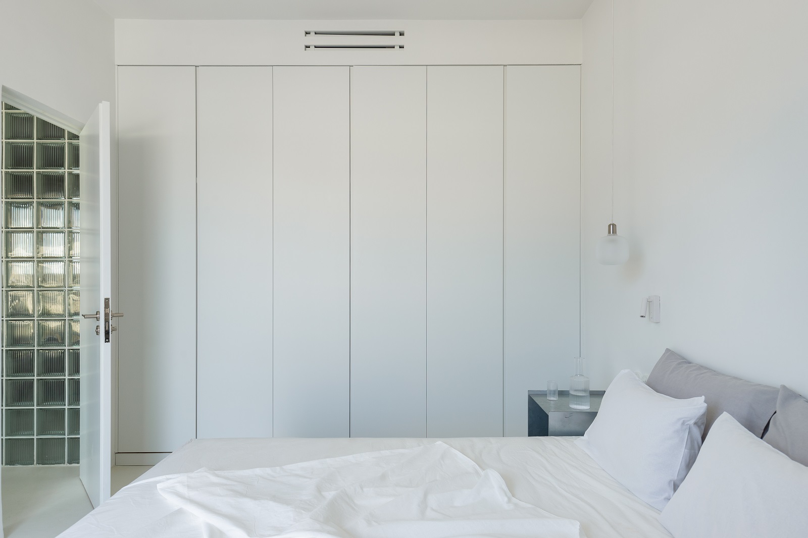 Ο μόνος χώρος που διατήρησε την αυστηρή του ιδιωτικότητα ήταν το υπνοδωμάτιο, χώρος ηρεμίας και ανασύνταξης από τους ρυθμούς της καθημερινότητας, σε λευκούς τόνους. Η κλιματιστική μονάδα εντάσσεται επίσης διακριτικά στον όγκο της ντουλάπας.