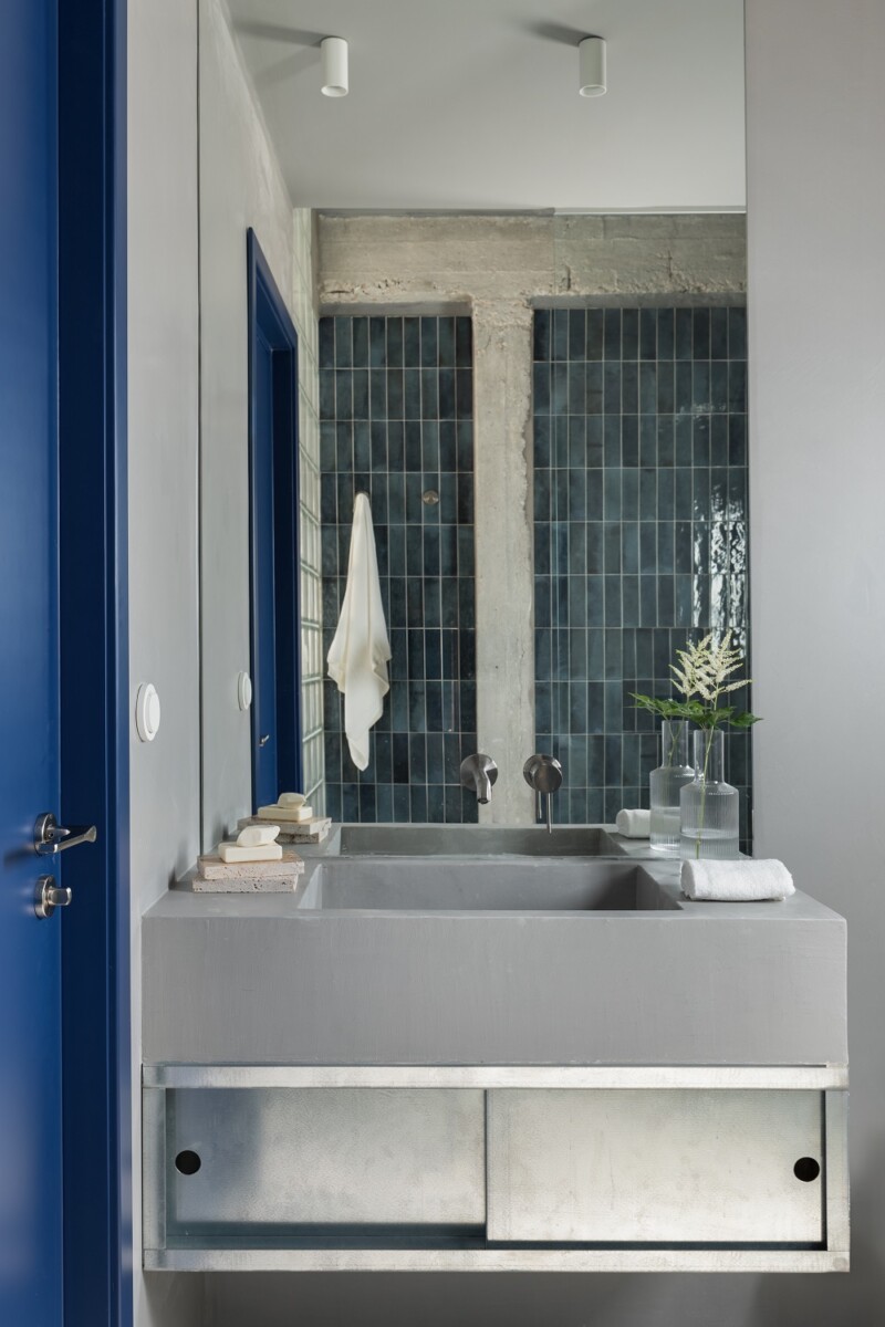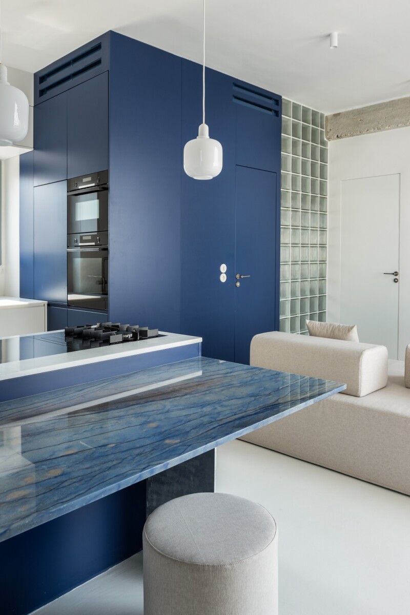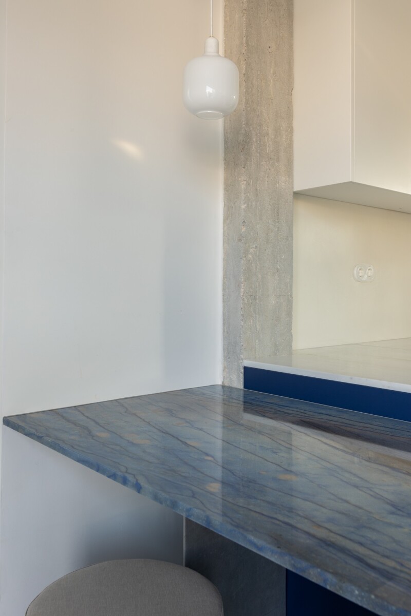 Η σπουδαιότητα της μαγειρικής και του φαγητού με παρέα για τον νεαρό ιδιοκτήτη ανέδειξε και την ανάγκη επιλογής ενός υλικού με έντονη ταυτότητα για το τραπέζι, ενός σπάνιου μπλε μαρμάρου που ακολουθεί τη χρωματική ταυτότητα του έργου.