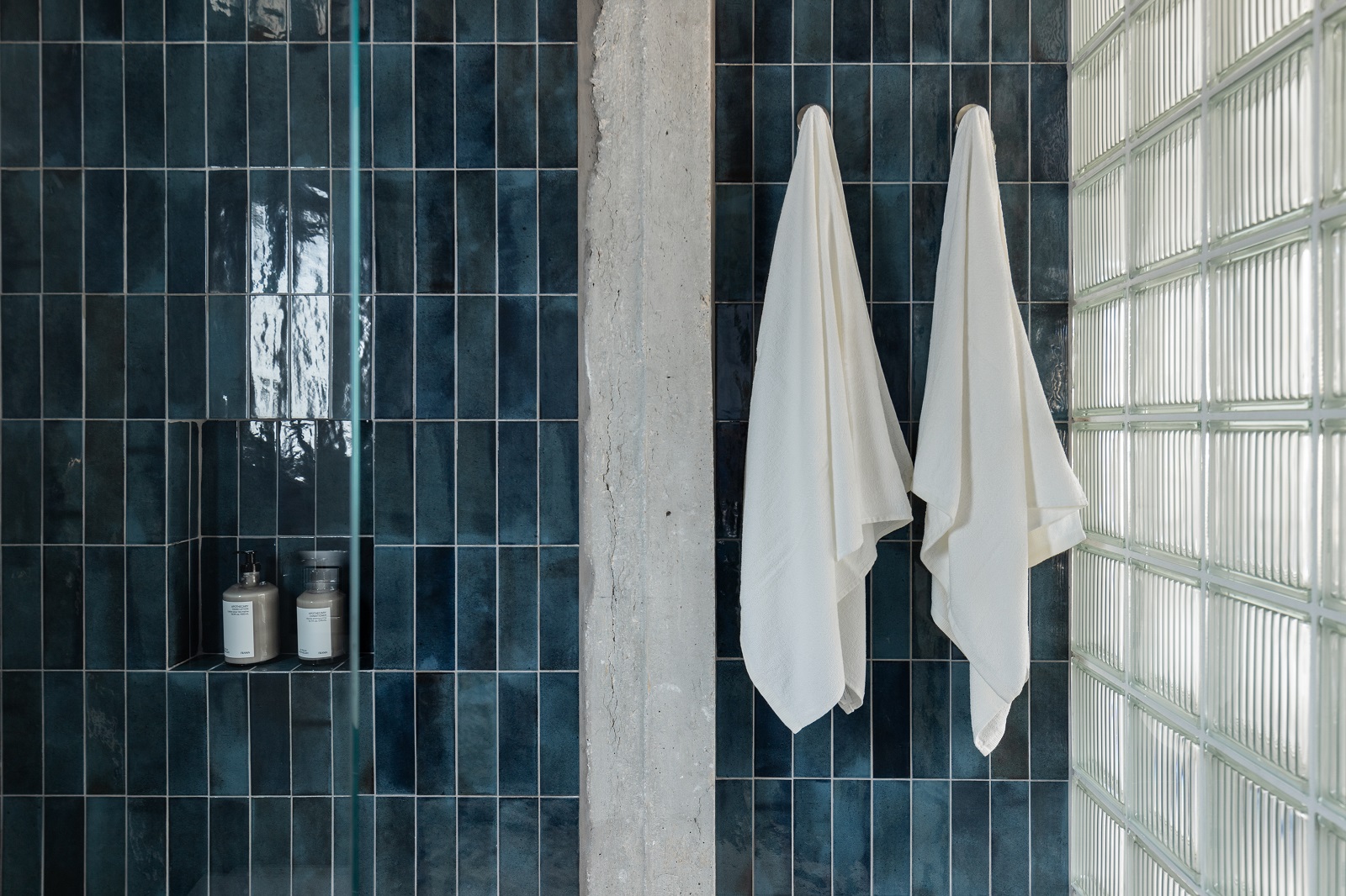 Στο μπάνιο, επιλέχθηκαν μικρής διάστασης πλακάκια, διατηρώντας μια ανάμνηση από τη δεκαετίας του ‘60. Το μικρό υπάρχον παράθυρο του μπάνιου δεν άφηνε πολλά περιθώρια φυσικού φωτισμού, κι έτσι υλοποιήθηκε η ιδέα της χρήσης υαλότουβλου στην περιοχή του ντους, ώστε να δέχεται επιπλέον φως από το φωτεινό καθιστικό.