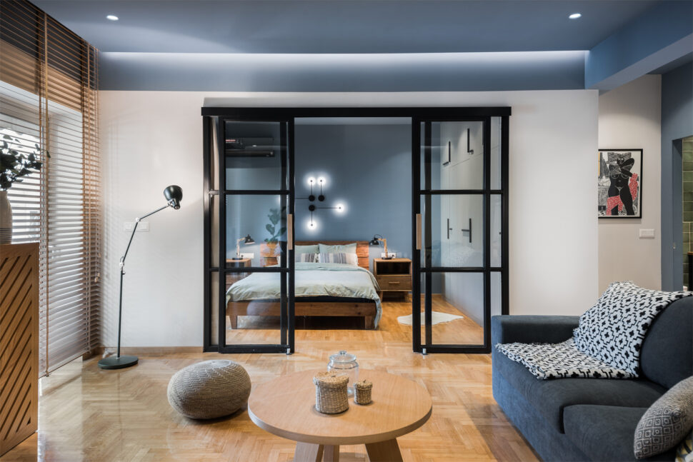 Οι μεταλλικές συρόμενες πόρτες με υαλοστάσια αποτελούν κεντρικό στοιχείο του διαμερίσματος και διαχωρίζουν το υπνοδωμάτιο από το καθιστικό, καθιστώντας τον χώρο εννιαίο όταν τα φύλλα μένουν ανοικτά.