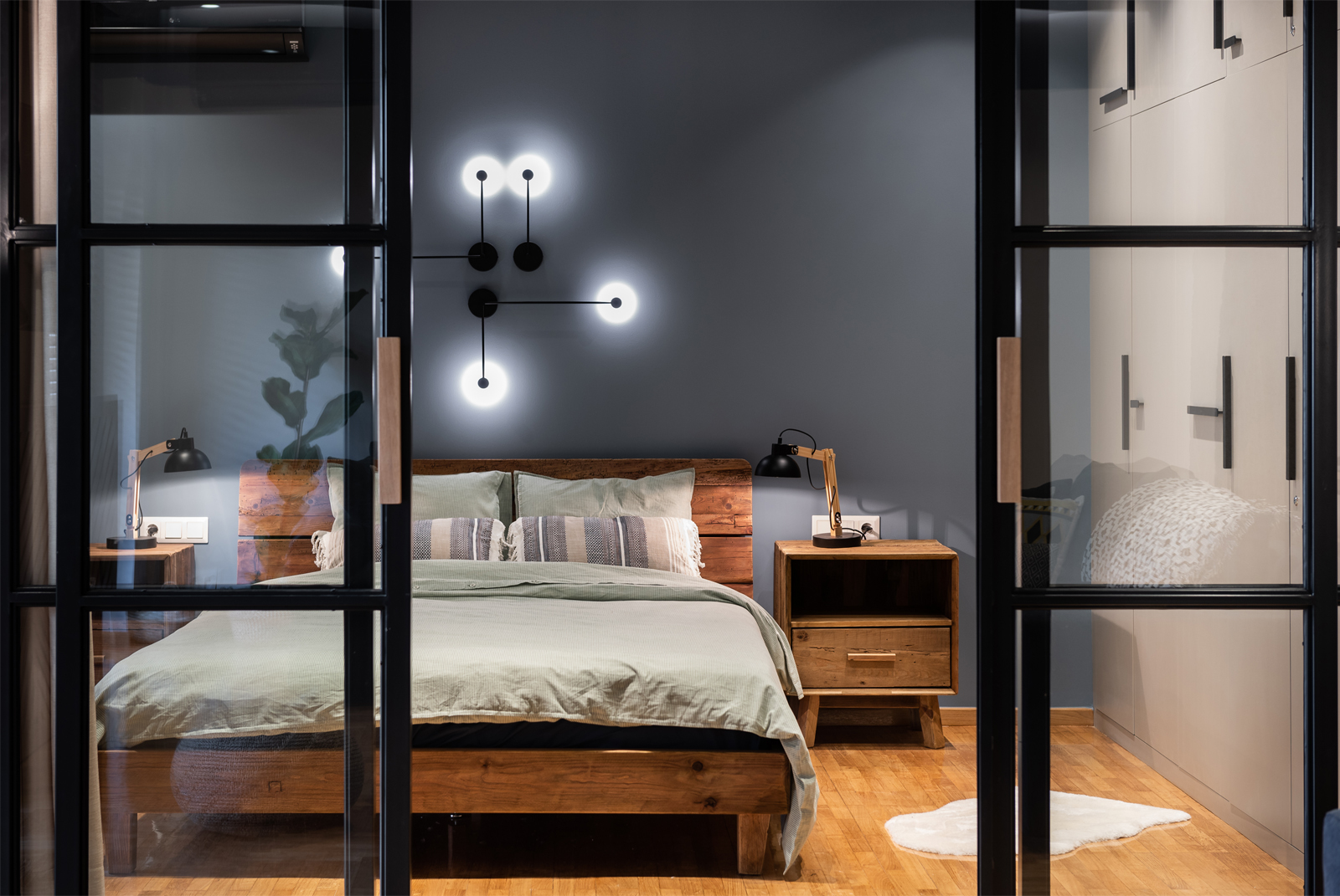 Οι μεταλλικές συρόμενες πόρτες με υαλοστάσια αποτελούν κεντρικό στοιχείο του διαμερίσματος και διαχωρίζουν το υπνοδωμάτιο από το καθιστικό, καθιστώντας τον χώρο εννιαίο όταν τα φύλλα μένουν ανοικτά.