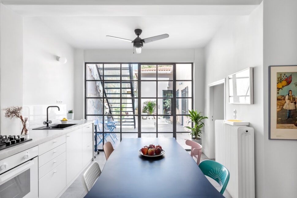 Στο εσωτερικό, η ανακαίνιση ισορροπεί ανάμεσα στο παλιό και το νέο, ενώ τα ψηλά ταβάνια και τα μεγάλα ανοίγματα γεμίζουν τους χώρους με φυσικό φως.