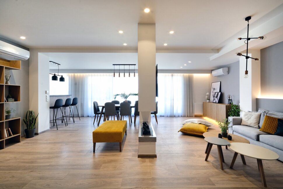 Η διακοσμητική προσέγγιση δίνει προβάδισμα στις γήινες αποχρώσεις, στην αντίθεση λευκού και μαύρου, στη διακριτική έκπληξη του κίτρινου, στη συνύπαρξη της ζεστασιάς του ξύλου με το δυναμικό μέταλλο και το αρχοντικό μάρμαρο.