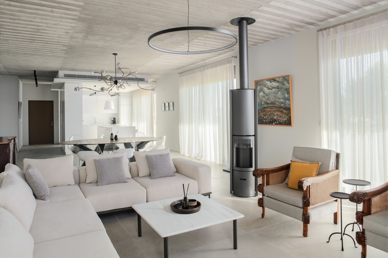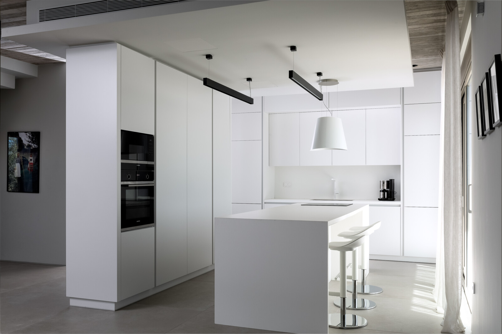 Ουδέτερες ανοιχτόχρωμες αποχρώσεις επιλέχτηκαν σε όλες τις υφές έτσι ώστε να τονιστούν οι όγκοι και οι γεωμετρίες, πετυχαίνοντας τον διαχωρισμό των λειτουργιών σε έναν ενιαίο χώρο. Μέσα από αυτές τις επιλογές επιτυγχάνεται η καλύτερη ανάδειξη των ατομικών έργων του ιδιοκτήτη, όπως πίνακες, φωτιστικά και ξύλινα γλυπτά.