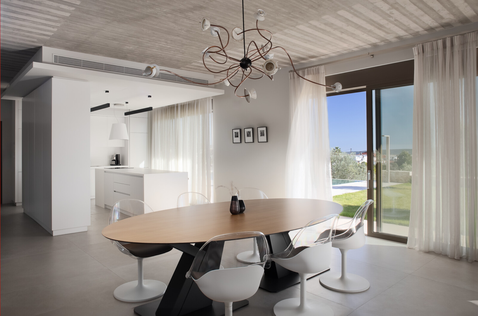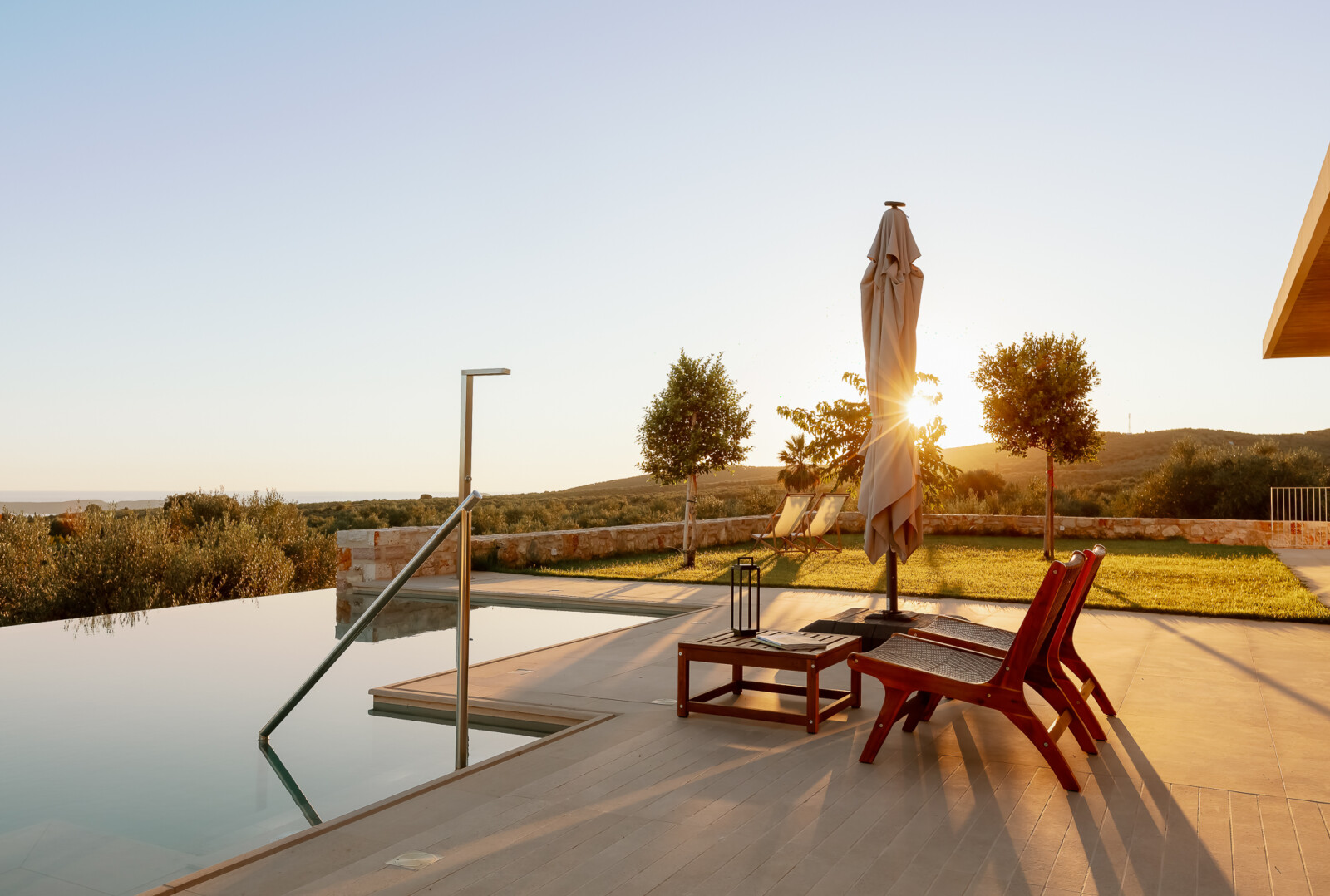 Πρωταγωνιστής της υπαίθριας ζωής στο κτήμα είναι η πισίνα, της οποίας η υδάτινη περίμετρος δημιουργεί μια απρόσκοπτη και πάντα παρούσα σχέση με το στοιχείο του νερού.