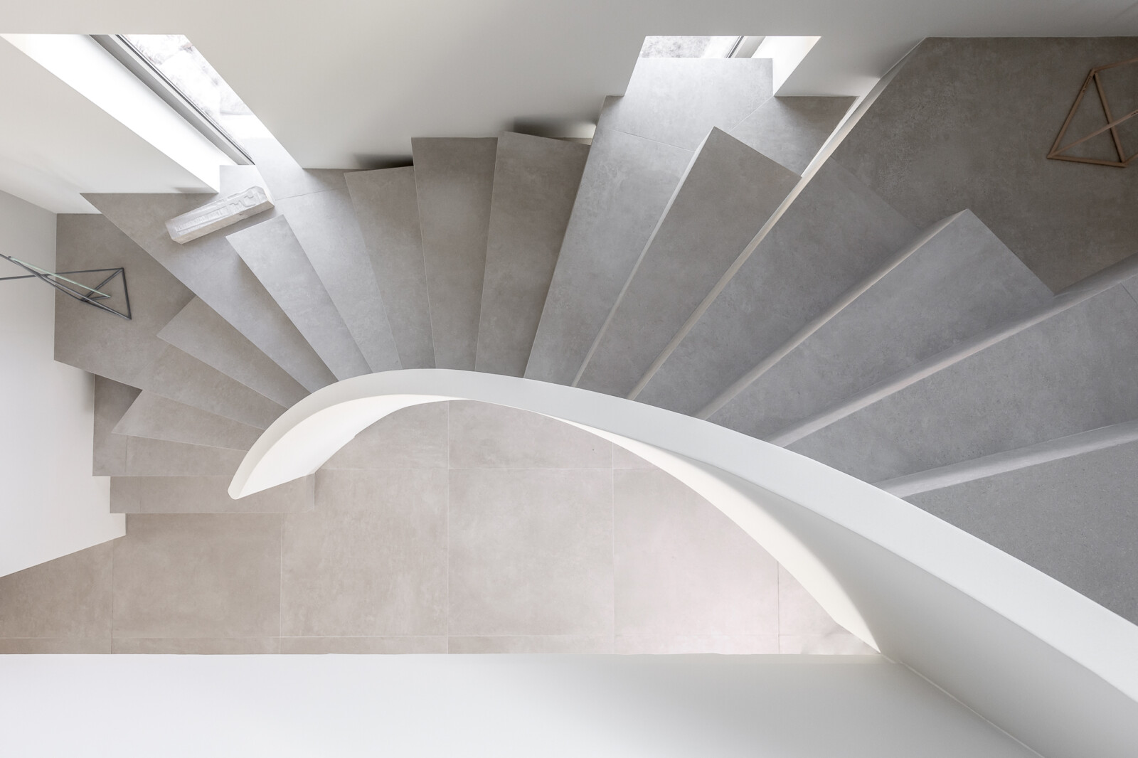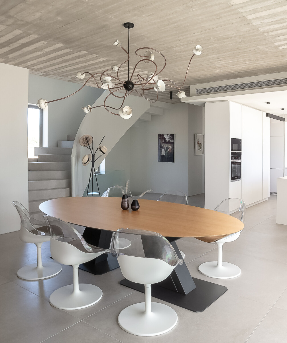 Κεντρικό στοιχείο του ισόγειου χώρου αποτελεί η ελλειπτική σκάλα με τον ιδιαίτερο σχεδιασμό, που οδηγεί στις δύο κρεβατοκάμαρες του πρώτου ορόφου.