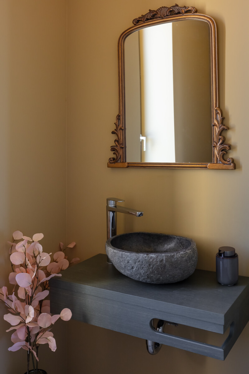 Στο ανατολικό τμήμα της κατοικίας σχεδιάστηκε ένα αυτόνομο δωμάτιο φιλοξενίας 30 τ.μ., ως μια απρόσκοπτη επέκταση του κεντρικού ισόγειου χώρου, το οποίο συνδέεται με το βασικό δομικό όγκο μέσω του ημιυπαίθριου χώρου.