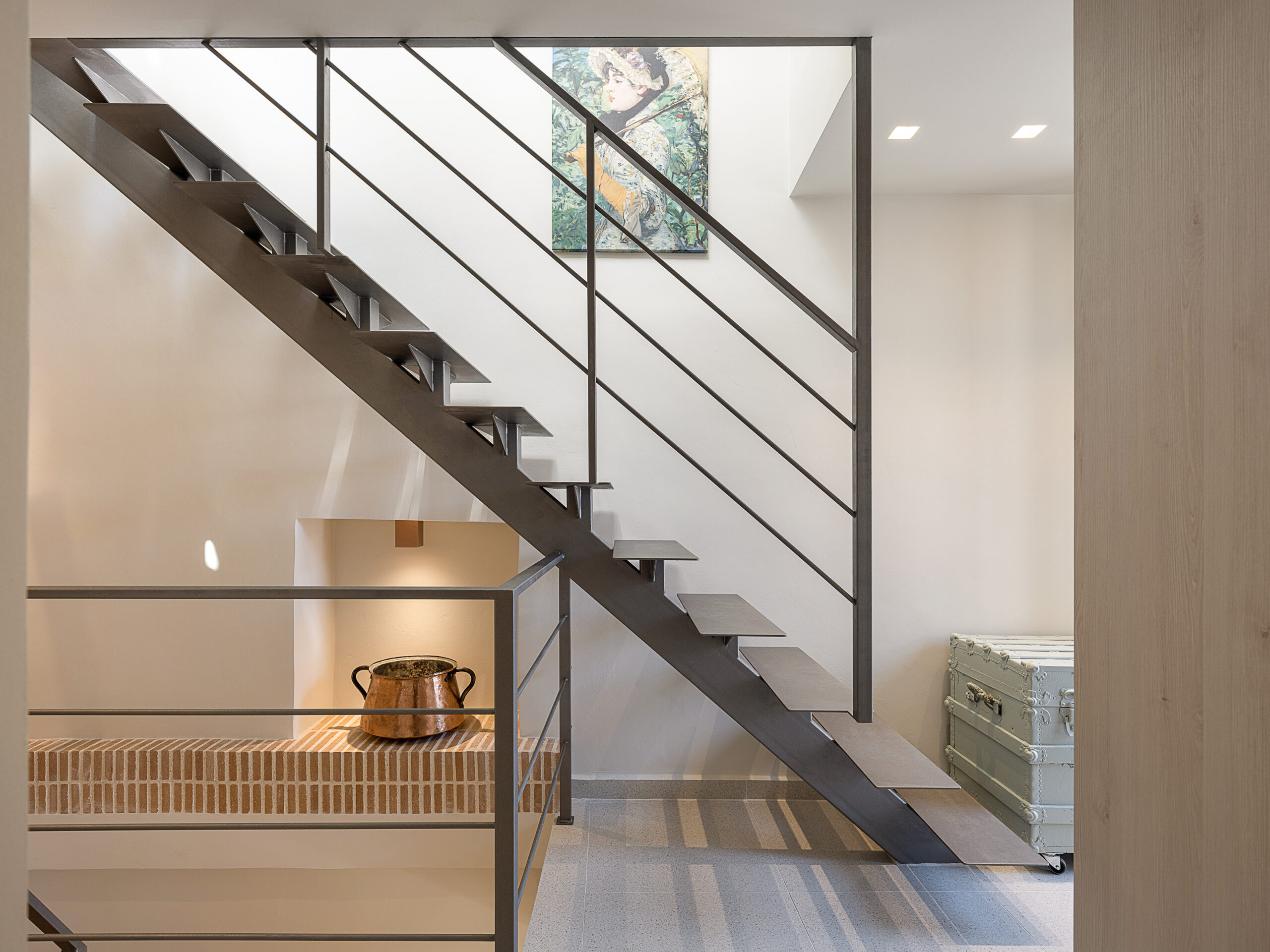 Το σπίτι χωρίστηκε στα δύο και σε κάθε διαμέρισμα ενσωματώθηκαν μεταλλικές σκάλες, οι οποίες προσφέρουν λειτουργικότητα και επιτρέπουν στο φυσικό φως να περάσει στο ισόγειο.