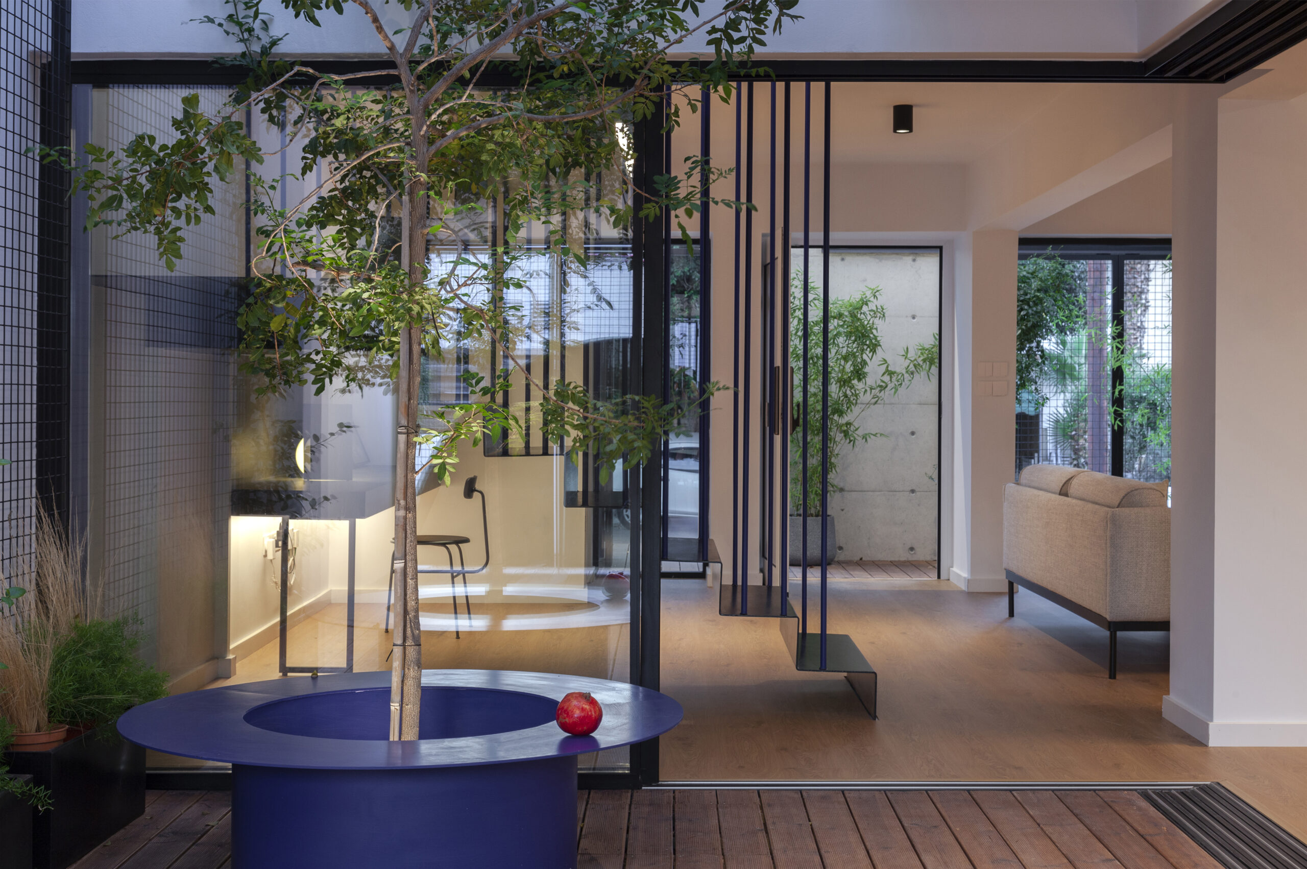 Στον πυρήνα του σπιτιού, αφαιρέθηκε μάζα από τον κτιριακό όγκο. Στο κέντρο του διάκενου χώρου έχει φυτευτεί ένα μαστιχόδεντρο, το οποίο πλαισιώνεται από κυκλική καθιστική επιφάνεια για να μετουσιωθεί σε έναν κεντρικό τόπο συνάθροισης ανάμεσα στα μέλη της οικογένειας.