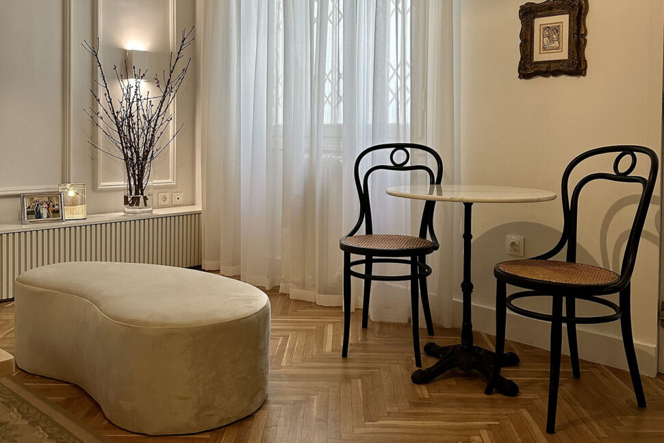 Τα δρύινα δάπεδα σε στυλ «ψαροκόκκαλο» διατηρήθηκαν ως ένα στοιχείο σύνδεσης με το παρελθόν.