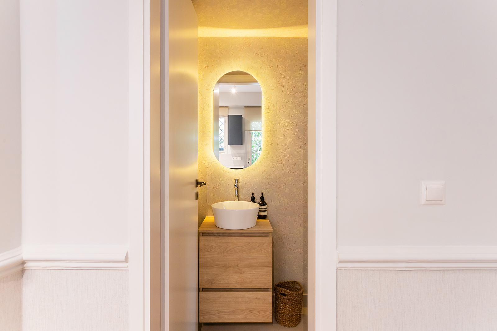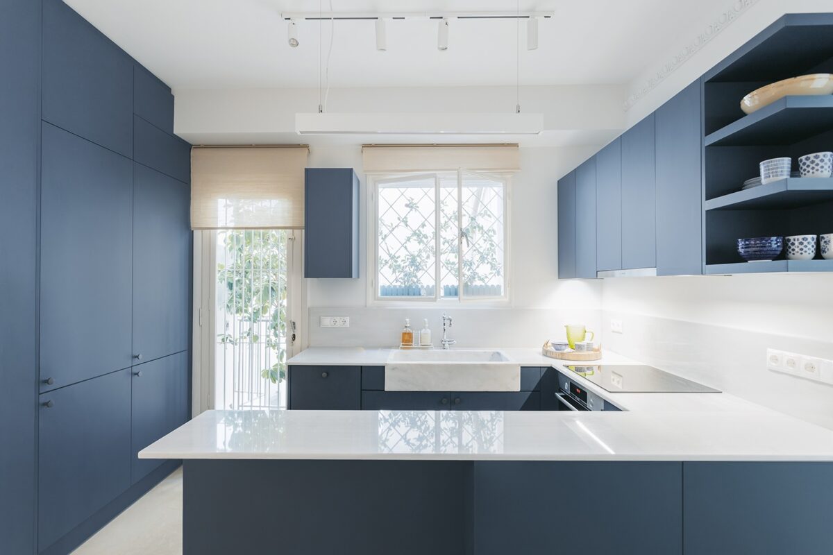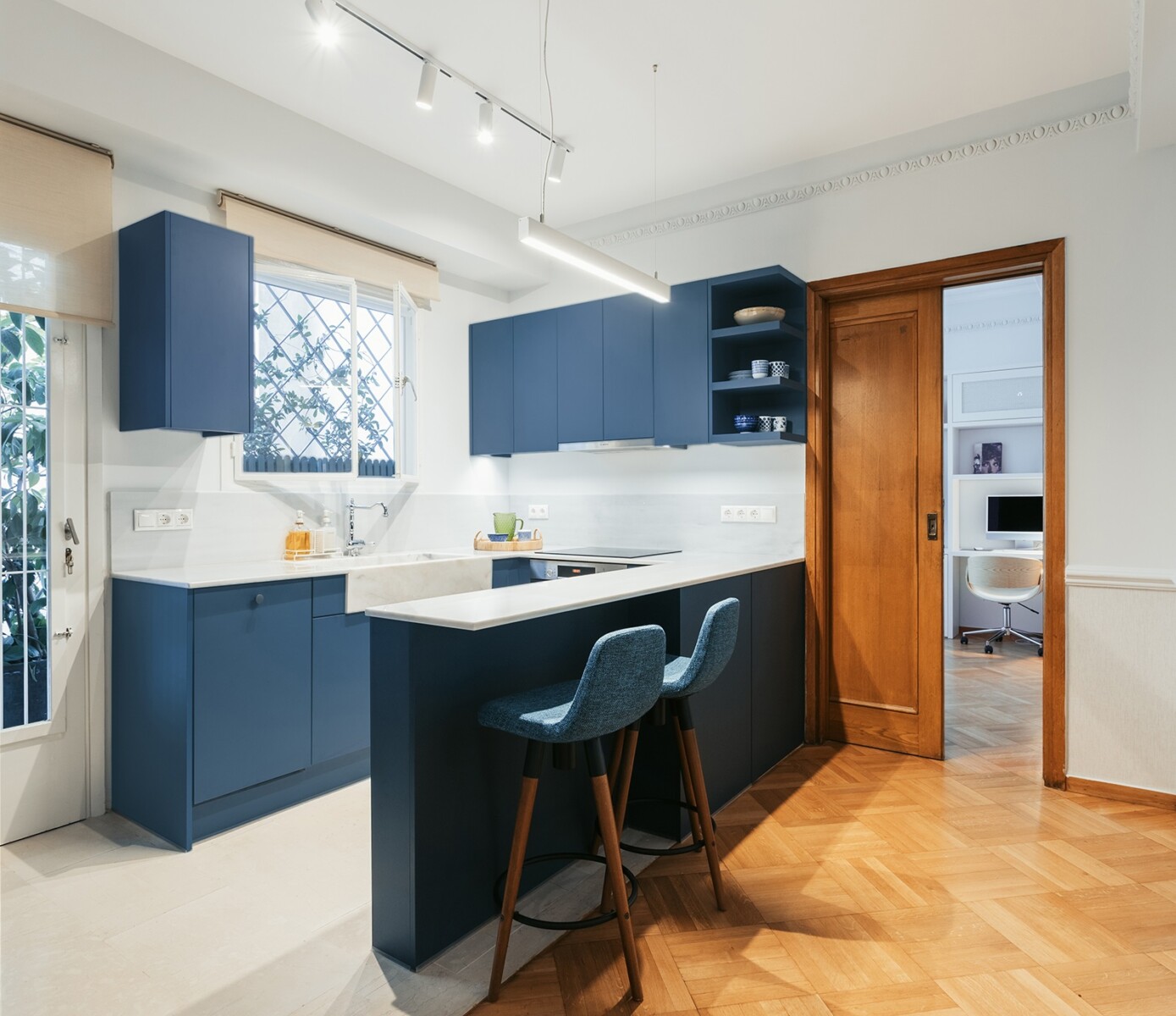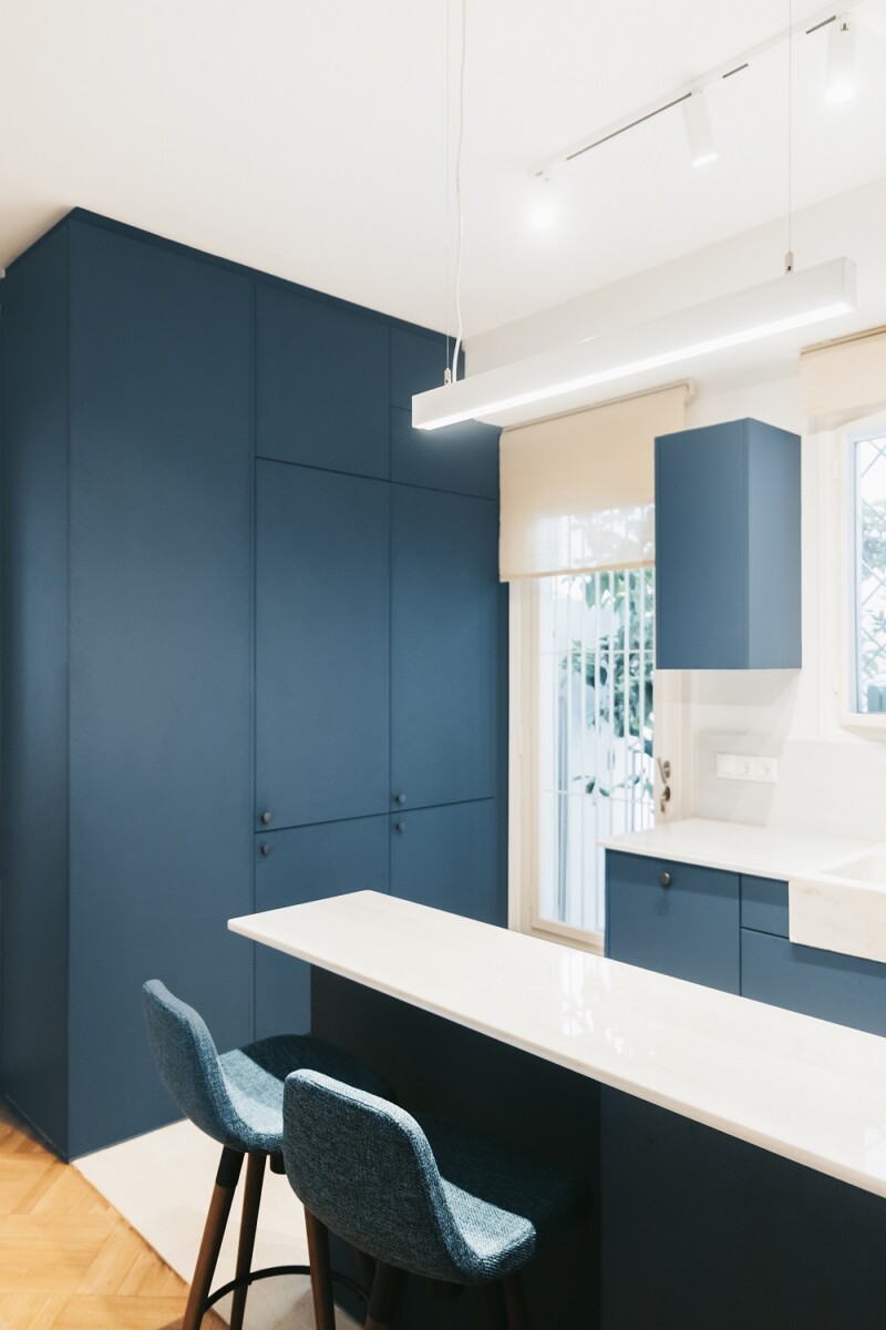 Στη νέα διαμόρφωση, η κουζίνα συνδέθηκε με το χωλ, δημιουργώντας έναν ενιαίο χώρο ως κεντρικό στοιχείο της καθημερινής ζωής στο διαμέρισμα. Αυτό που ήταν απλώς μια κουζίνα υπηρεσιών, η οποία δεν πληρούσε καμία κοινωνική παράμετρο σύμφωνα με τη σύγχρονη διαβίωση, έγινε ένας λειτουργικός κοινωνικός πυρήνας.