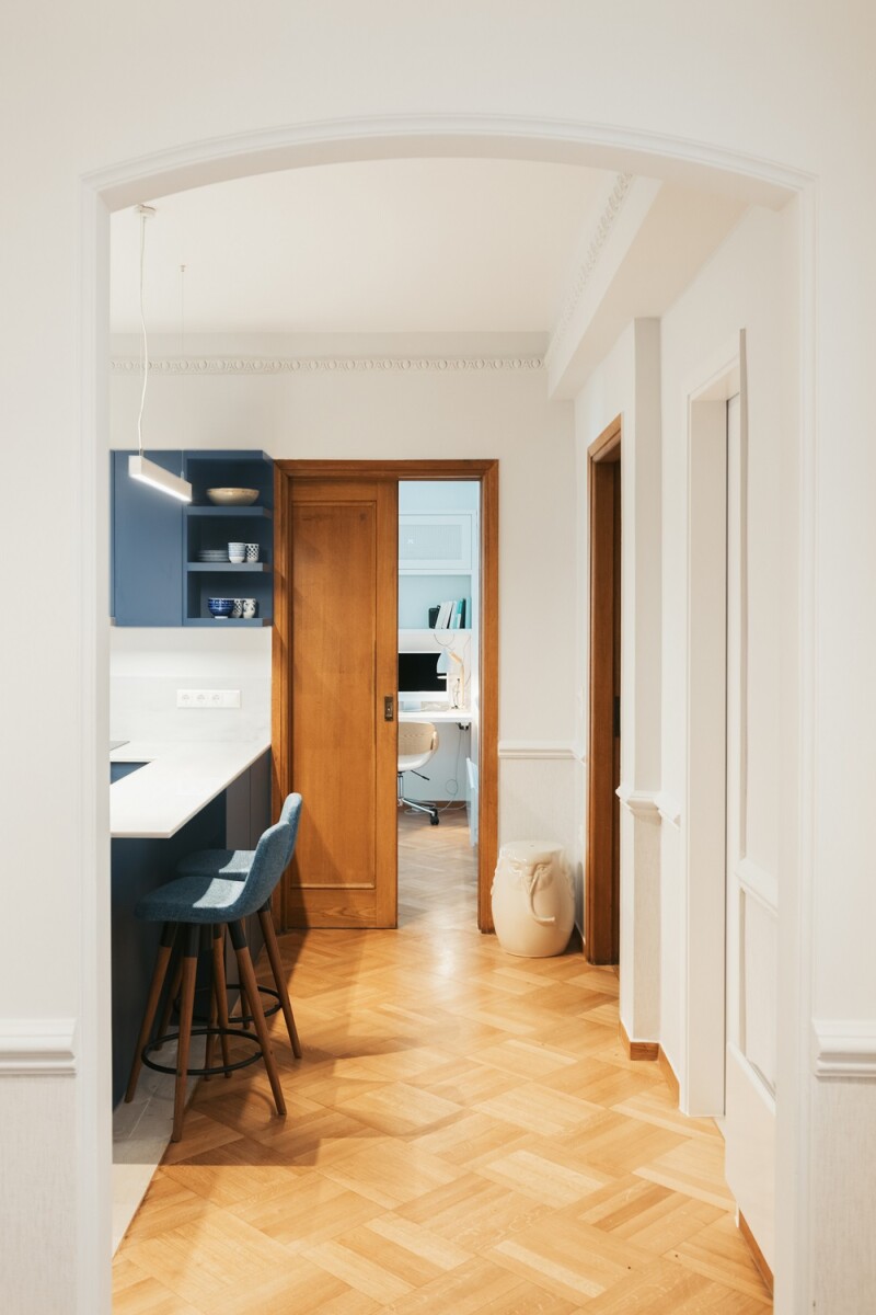 Το υπέροχο παρκέ, οι βαριές δρύινες πόρτες, τα μεταλλικά κουφώματα, το τοξωτό κατώφλι, ο γύψινος διάκοσμος στους τοίχους και τις οροφές, μέχρι και ο μαρμάρινος νεροχύτης, ενσωματώνονται στις καθαρές γραμμές του νέου σχεδιασμού, επιτυγχάνοντας μια σύγχρονη κομψότητα και μια αστική ηρεμία.