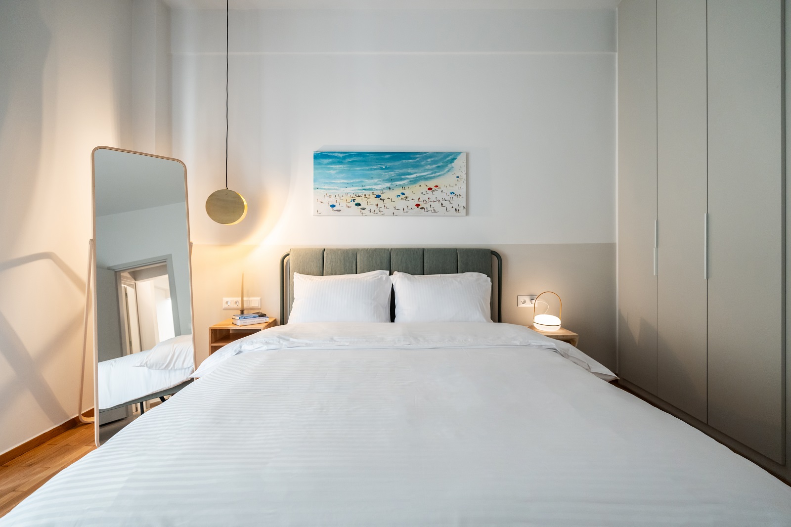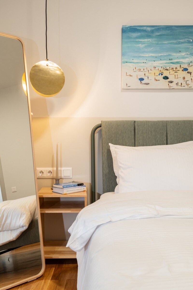 Συγκεκριμένα, το ξύλινο δάπεδο σε όλο το διαμέρισμα, τα μικρής κλίμακας σε καφέ ματ απόχρωση πλακάκια της κουζίνας, όπως και οι μπεζ ξυλουργικές επιφάνειες των ντουλαπών και της κουζίνας, λειτουργούν ως «φόντο», υποδέχονται τις χρωματικές πινελιές των υπόλοιπων ξυλουργικών επιλογών και διακοσμητικών στοιχείων.