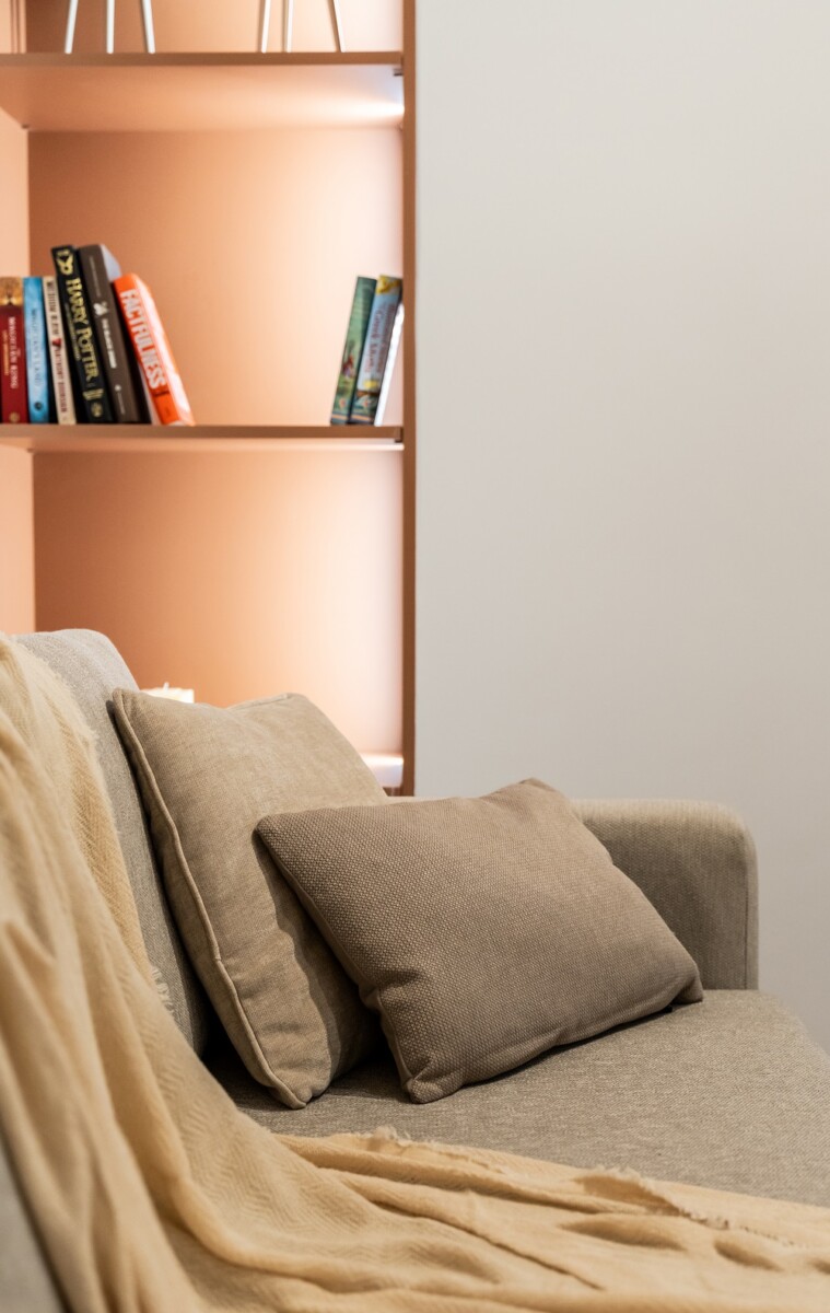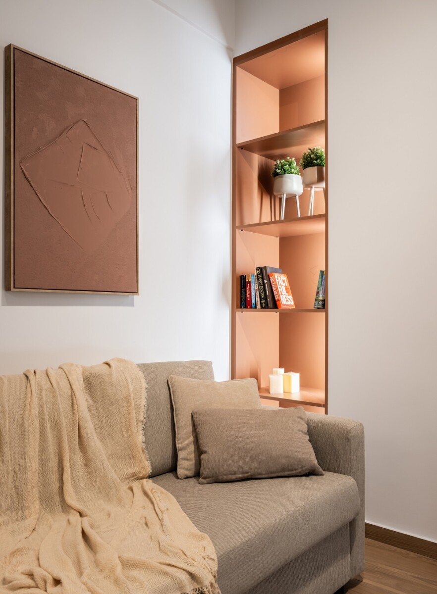 Οι ιδιοκατασκευές, που απαρτίζονται από τη βιβλιοθήκη, το έπιπλο της τηλεόρασης σε χρώμα τερακότα, καθώς και το παγκάκι της τραπεζαρίας σε σκούρο μπλε χρώμα, δημιουργούν μια παιχνιδιάρικη και ζωηρή ατμόσφαιρα. Αυτή η διάθεση ενισχύεται παράλληλα και από την επιλογή των φωτιστικών σε χρώμα τερακότα και χρυσό.