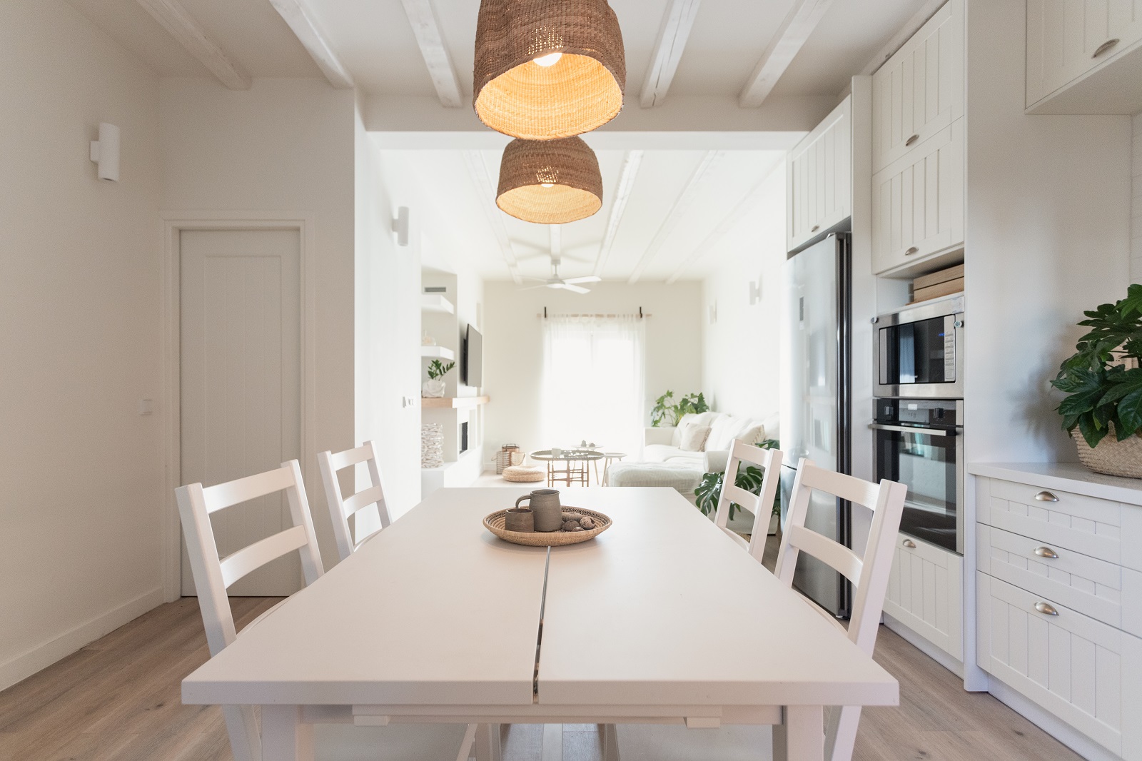 Τα λευκά ξύλινα δοκάρια καστανιάς που τοποθετούνται στην οροφή δημιουργούν ένα έντονο ενοποιητικό υφολογικό στοιχείο.