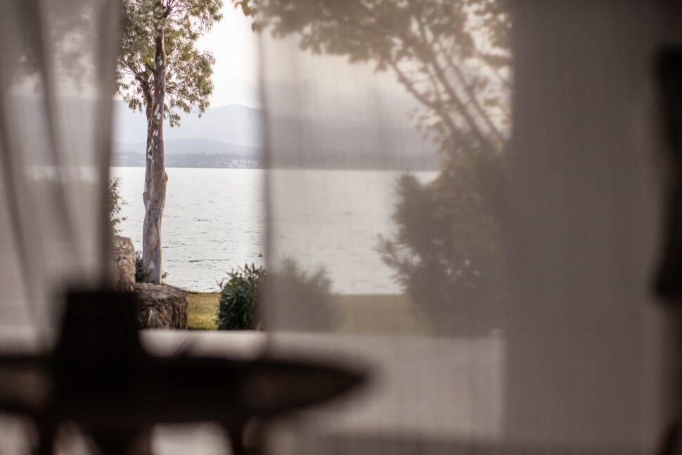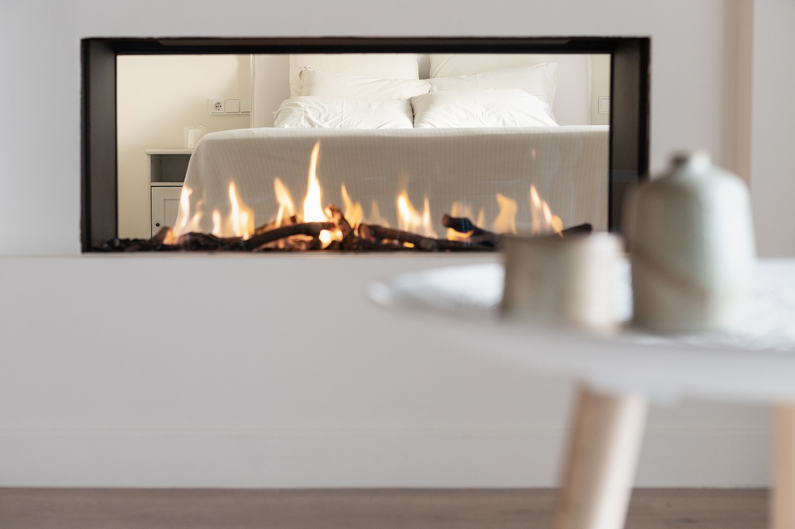 Παράλληλα, με τη λειτουργία του, το τζάκι δημιουργεί μια ατμόσφαιρα ζεστασιάς και γαλήνης, σε αντίθεση με το ύφος του εξωτερικού παραθαλάσσιου συνόλου, διαμορφώνοντας έτσι την κατοικία σε ένα ιδανικό μέρος και για χειμερινές αποδράσεις.