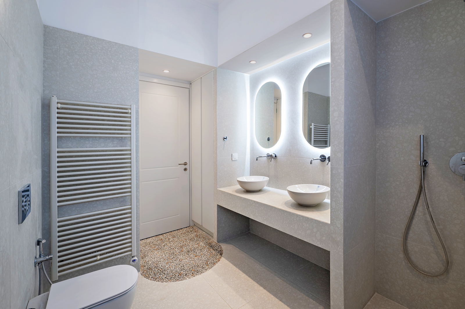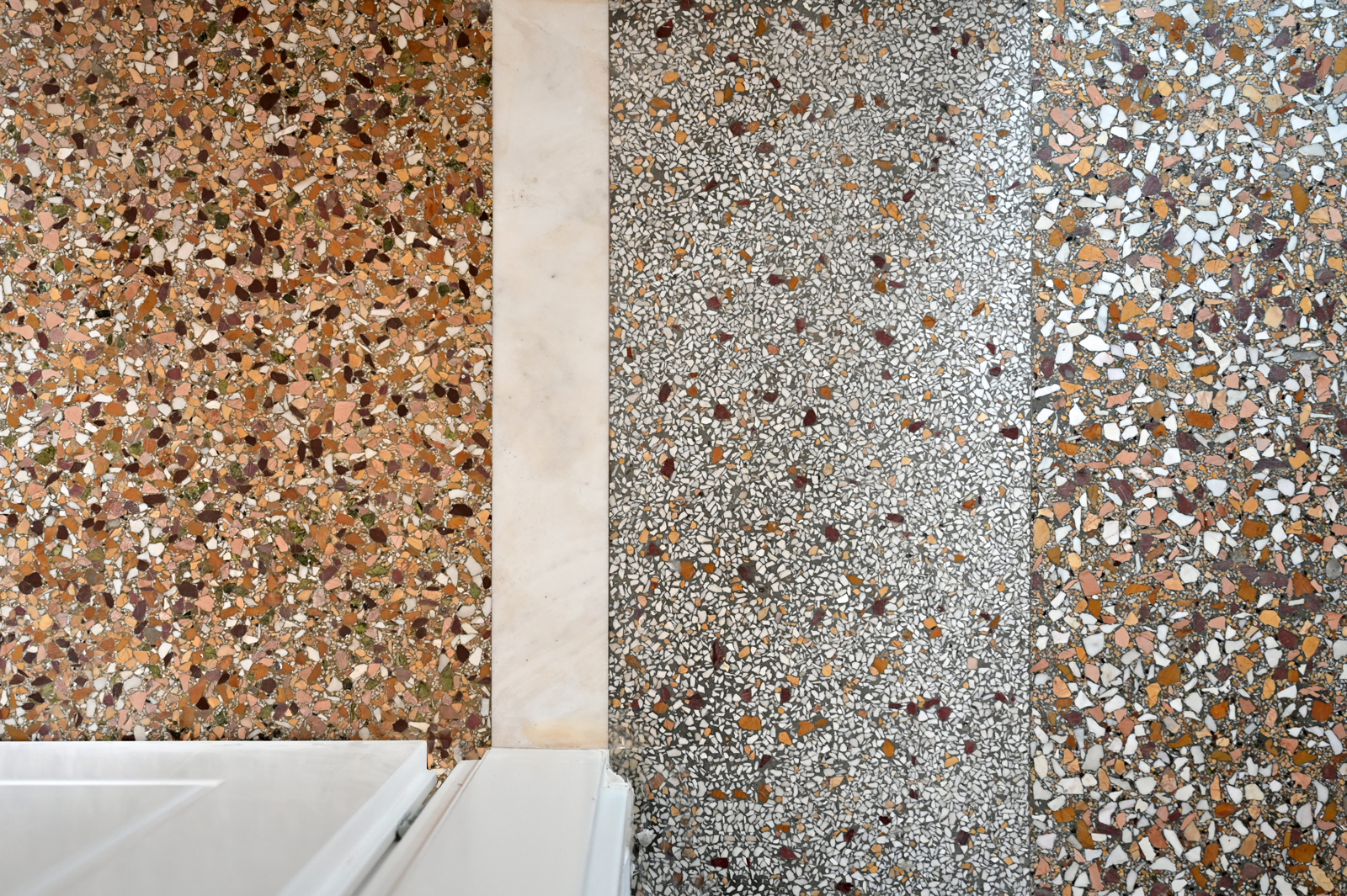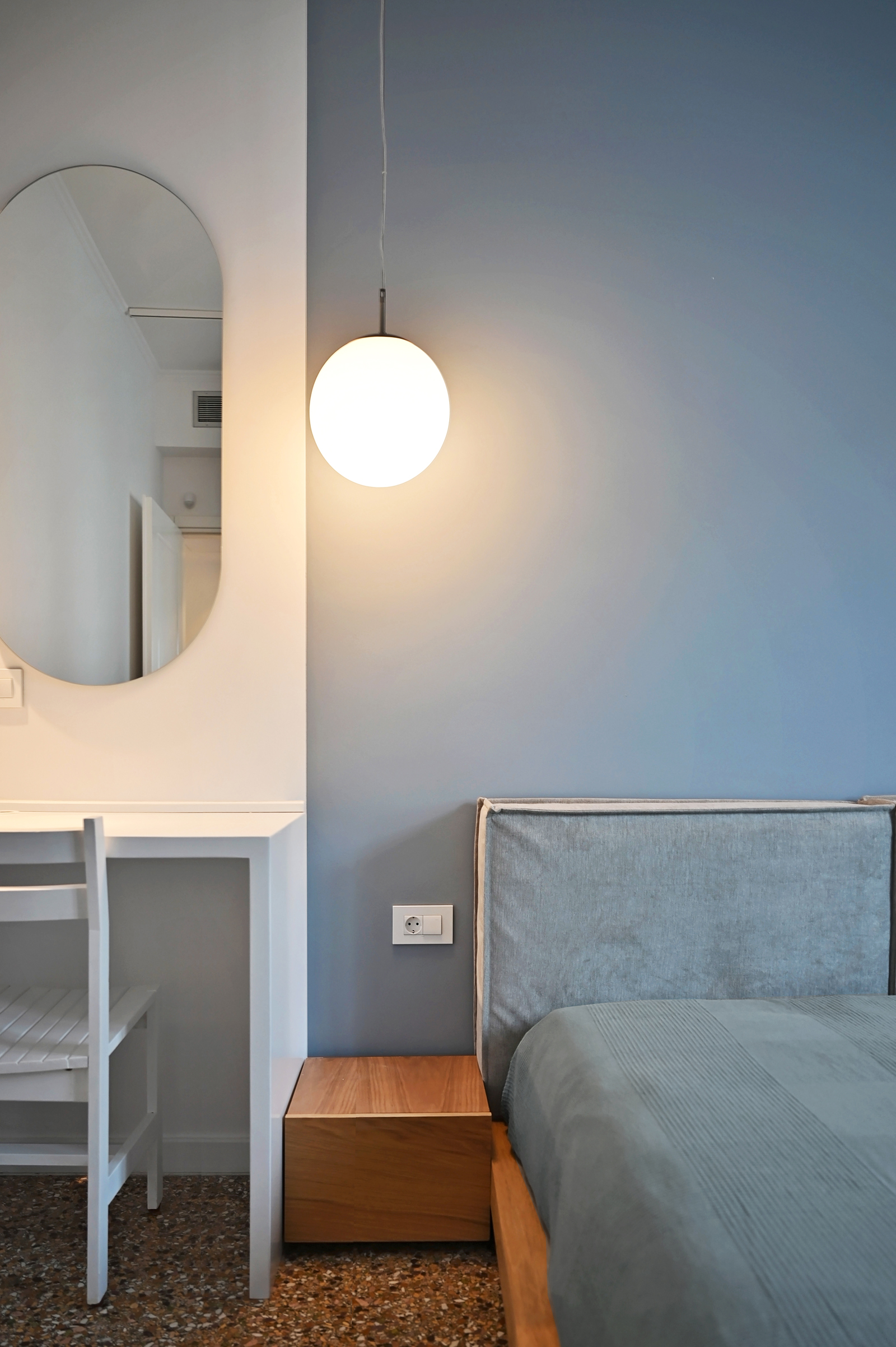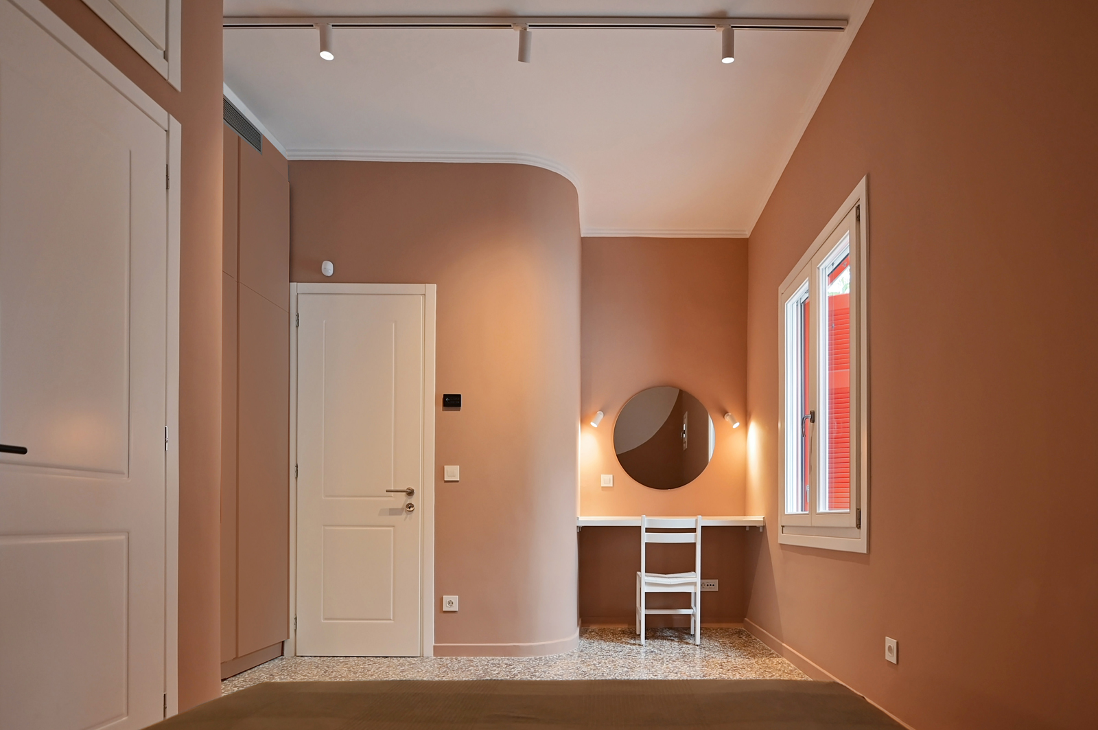 Μια δεύτερη γεωμετρία εισάγεται στη νέα διάταξη. Το ροζ, το λευκό και το μπλε προσθέτουν το στοιχείο του χρώματος μέσα στα δωμάτια με τρόπο απροσδόκητο, δημιουργώντας υποχώρους.