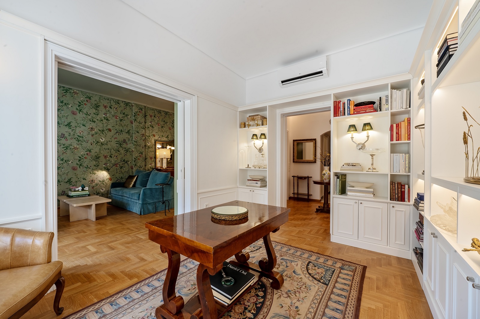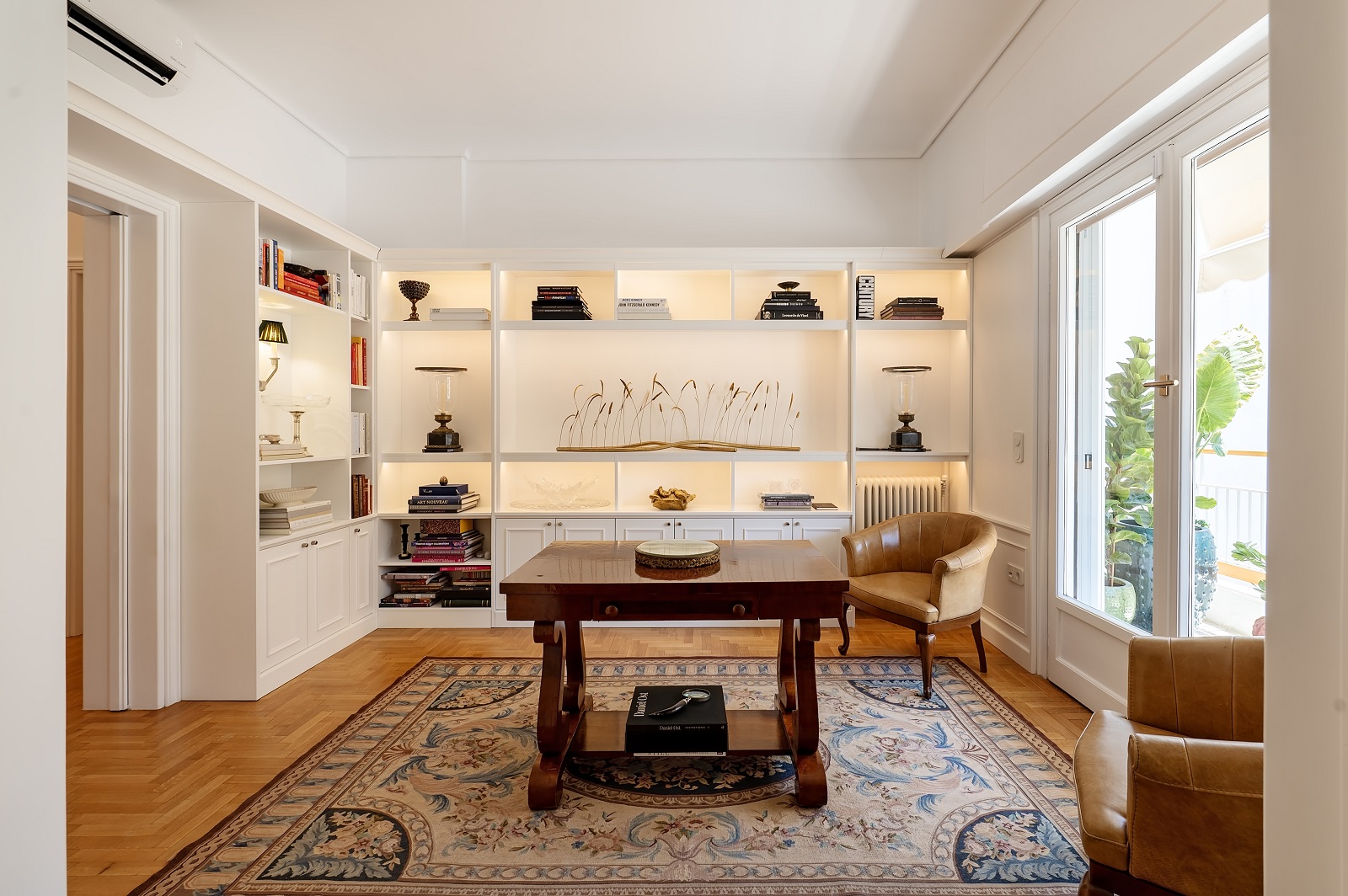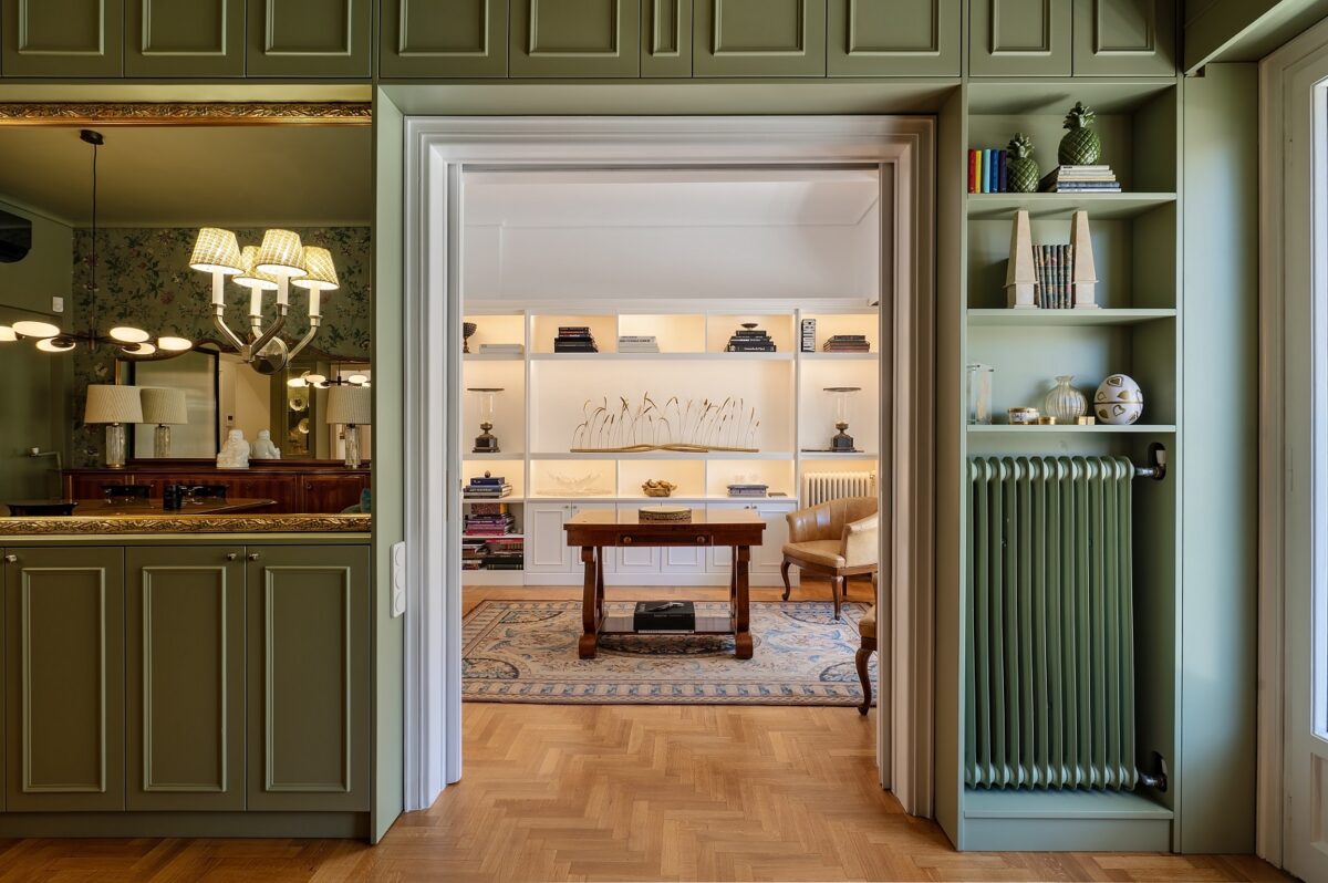 Οι ειδικά σχεδιασμένες κατασκευές αποτελούν βασικό συνθετικό εργαλείο. Ντουλάπια, βιβλιοθήκες και επενδύσεις καλοριφέρ ενσωματώνονται στην αρχιτεκτονική του χώρου, ακολουθώντας τις υπάρχουσες αναλογίες και ενισχύοντας τη συνοχή του συνόλου. Η σχέση ανάμεσα στο παλιό και το νέο παραμένει διακριτική, με τις σύγχρονες παρεμβάσεις να «συμπληρώνουν» την υπάρχουσα δομή χωρίς να την επισκιάζουν.