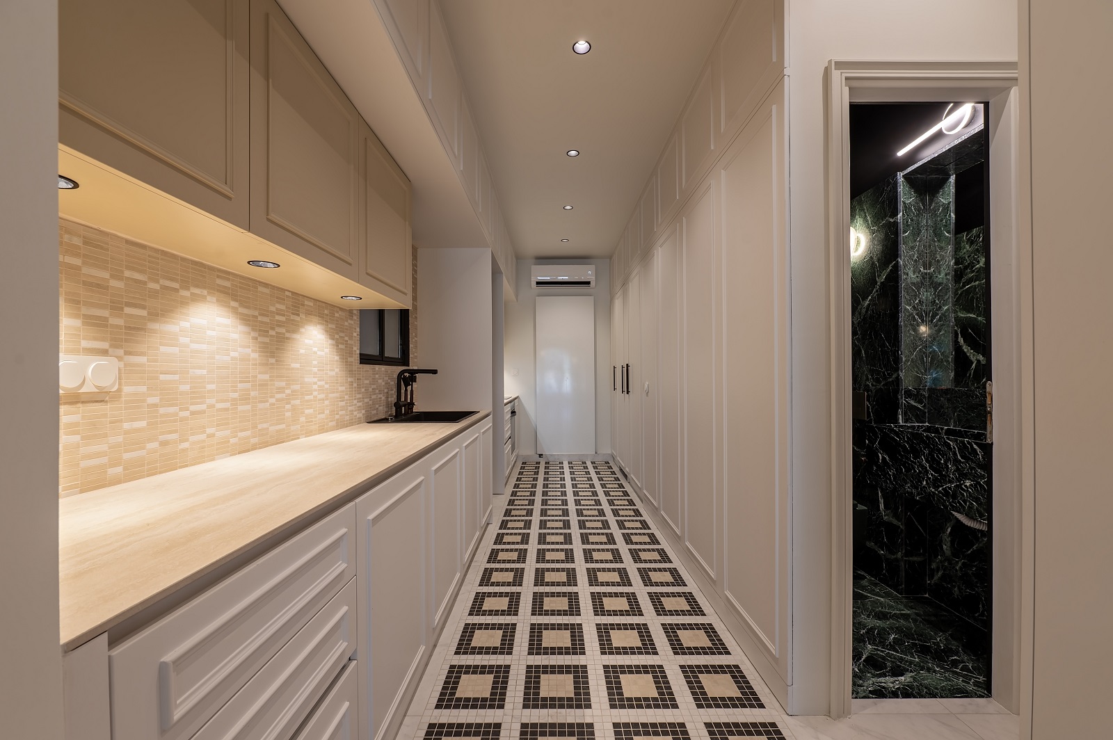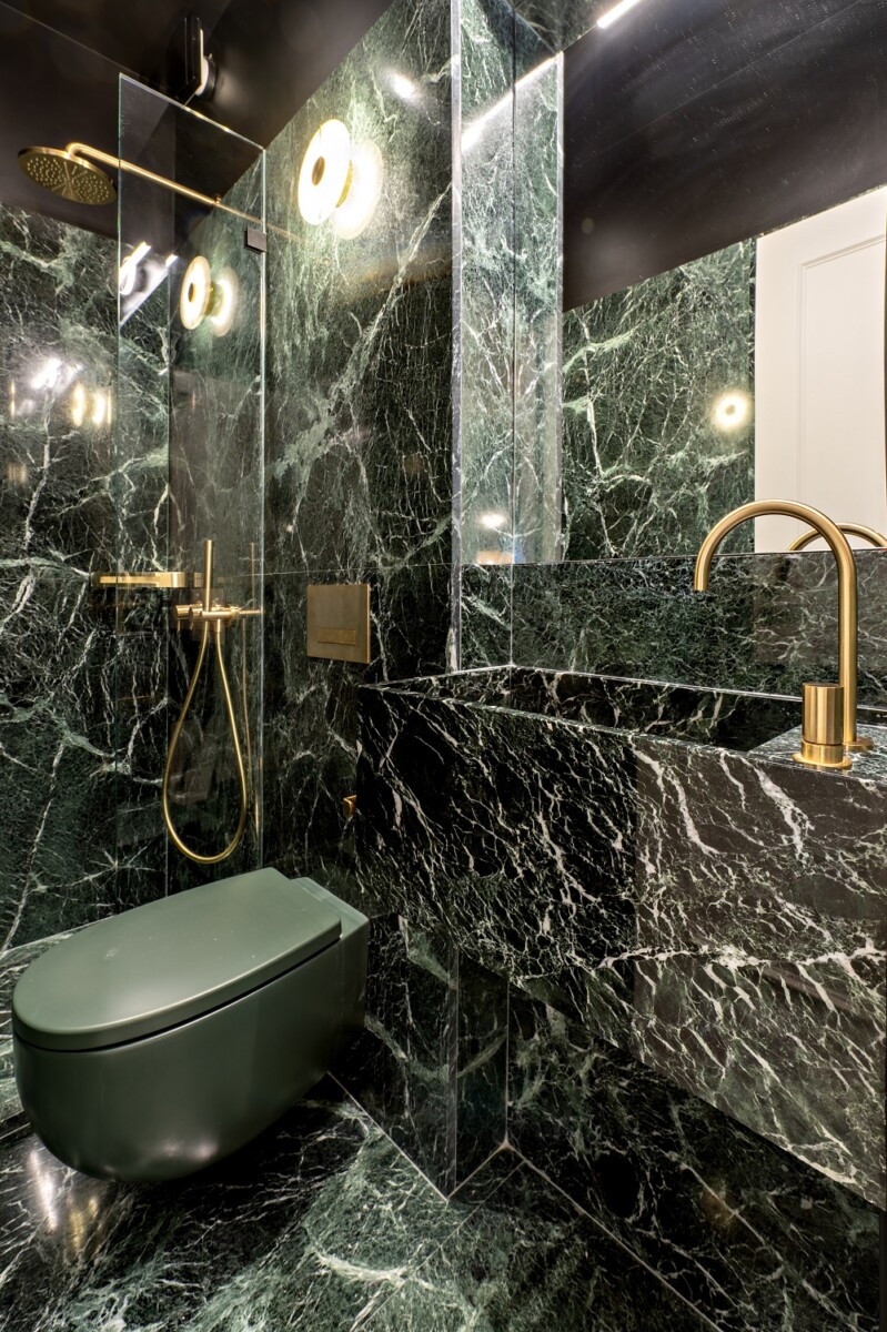 Η κουζίνα επανασχεδιάζεται με συνδυασμό λευκών, μπεζ και μαύρων υλικών, συγκροτώντας έναν αυστηρά γραμμικό χώρο με καθαρές στοχίσεις. Το λουτρό των επισκεπτών επενδύεται εξ ολοκλήρου με πράσινο μάρμαρο Τήνου, αποκτώντας έναν έντονα υλικό και σχεδόν μονοχρωματικό χαρακτήρα.