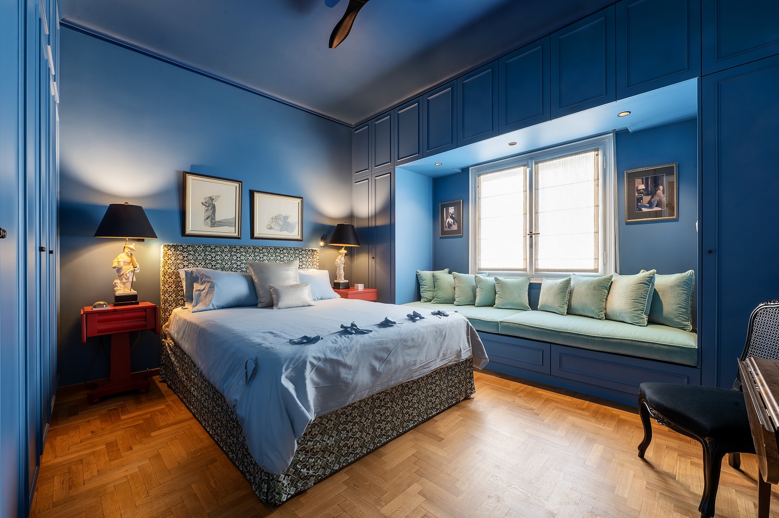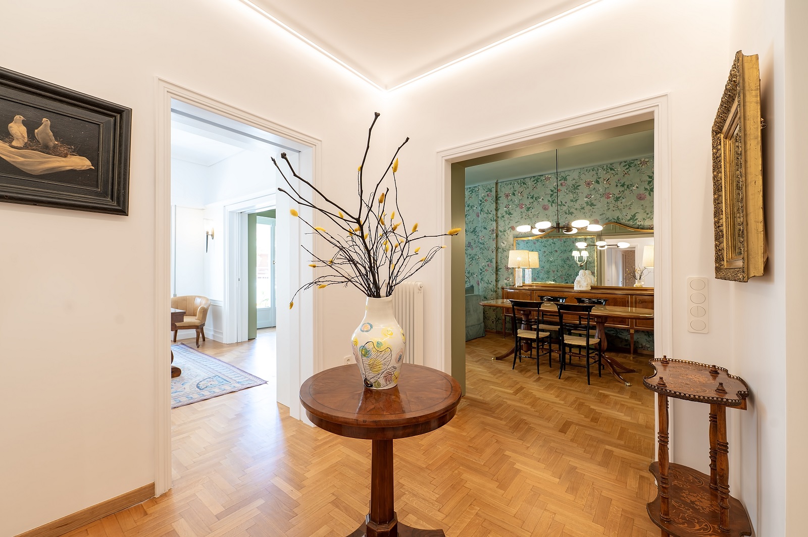 Το χρώμα αναλαμβάνει πρωταγωνιστικό ρόλο στη συγκρότηση της ταυτότητας κάθε χώρου. Πράσινοι τόνοι κυριαρχούν στους χώρους διημέρευσης και τραπεζαρίας, σε συνδυασμό με floral ταπετσαρίες που παραπέμπουν σε εσωτερικά κατοικιών της δεκαετίας του ’50 και του ’60. Η παλέτα συμπληρώνεται από ξύλινες επιφάνειες, μπρούτζινες λεπτομέρειες και επιλεγμένα έπιπλα με καμπύλες φόρμες, δημιουργώντας μια ατμόσφαιρα αστικής κομψότητας και οικειότητας.
