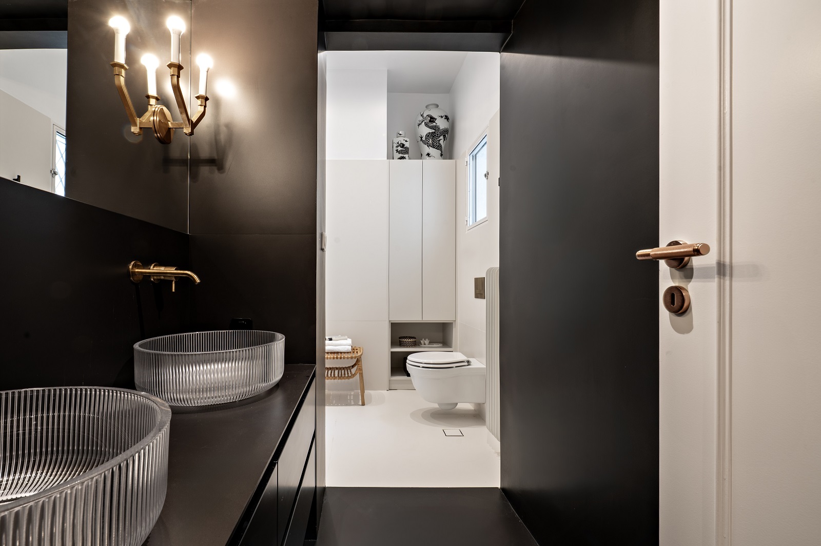 Το κυρίως λουτρό οργανώνεται σε δύο διακριτές ζώνες, σε λευκό και μαύρο, ενισχύοντας την αντίθεση και τη λειτουργική ιεράρχηση.